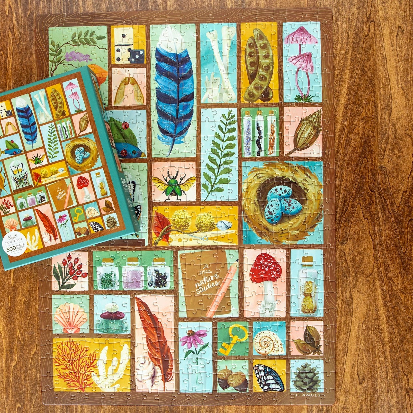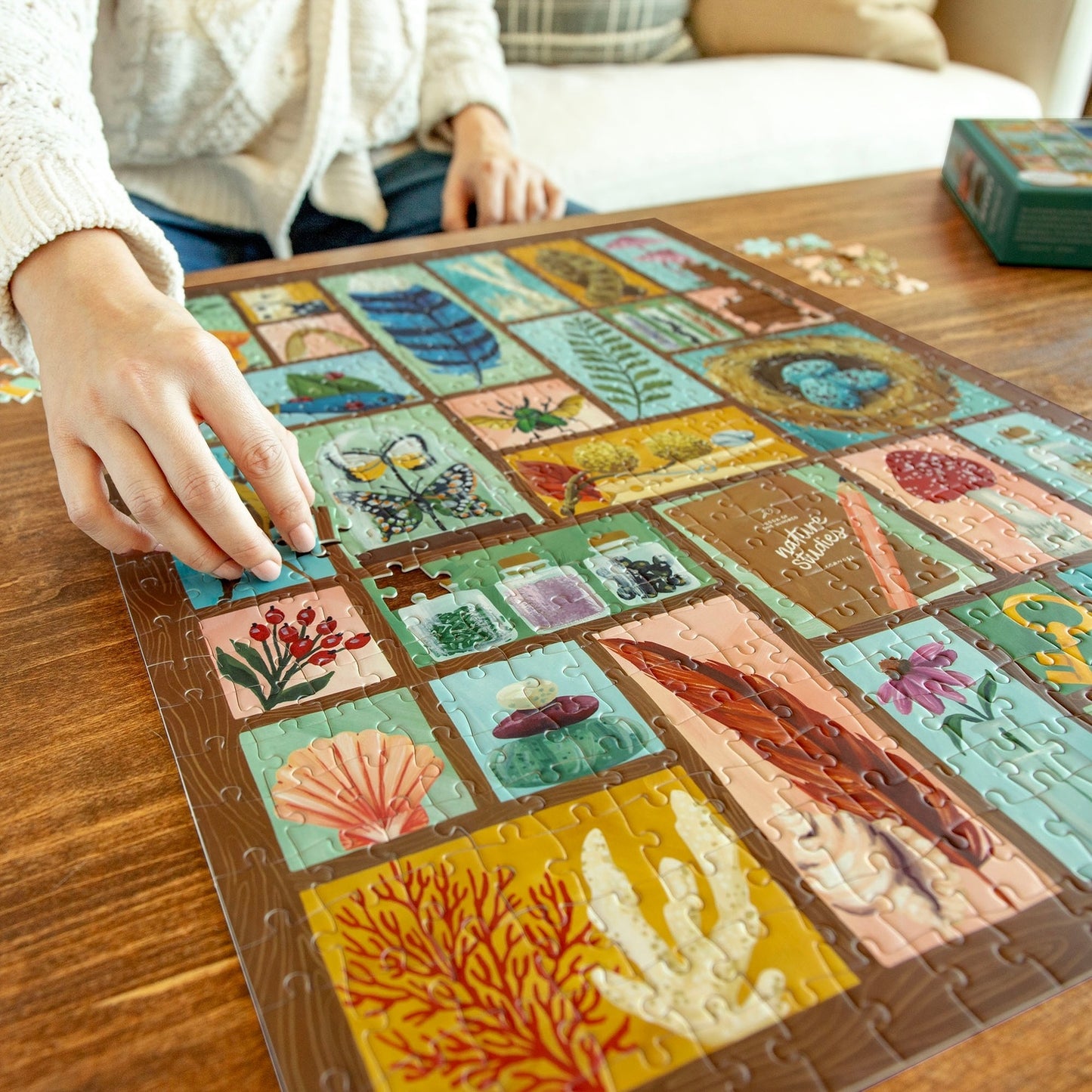 This unique puzzle features illustrations in a curio cabinet shadow box style, showcasing a curated collection of nature's wonders, including mushrooms, feathers, insects, a magnifying glass, acorns, and more. Each piece contributes to the charm of this exquisite puzzle, offering a delightful challenge for nature enthusiasts and puzzle aficionados alike. Immerse yourself in the artistry of Gathered Treasures, creating a stunning scene that celebrates the intricate elements found in the natural world.