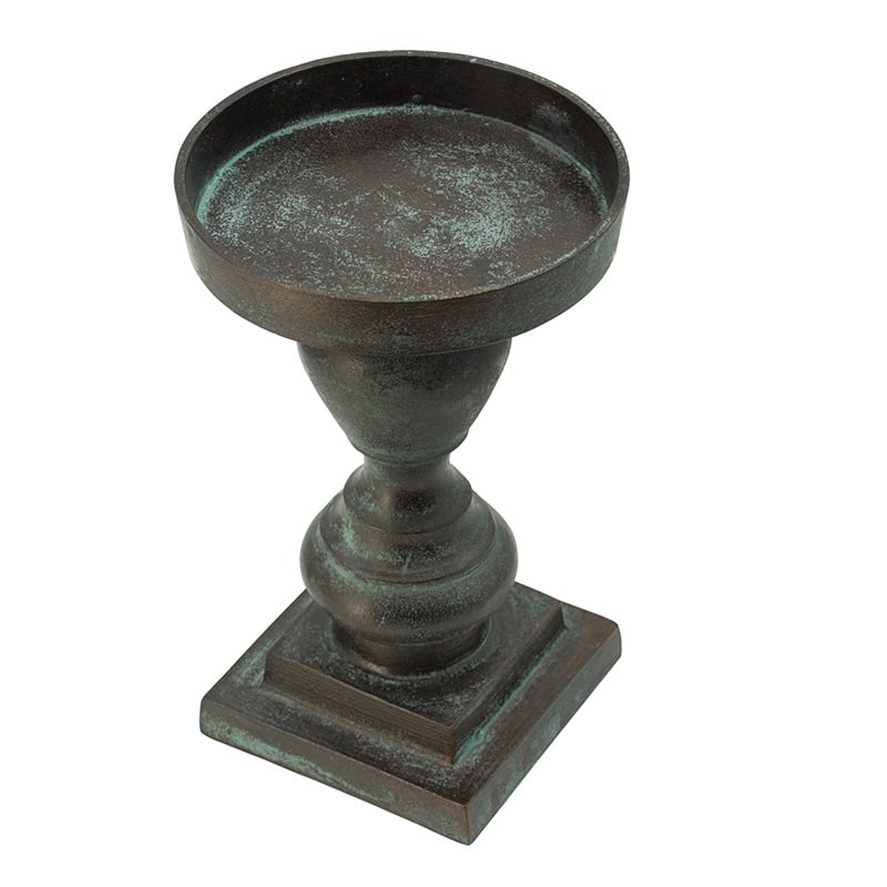 This metal pillar holder has a timeworn patina finish that compliments the traditional pedestal and square base design perfectly.