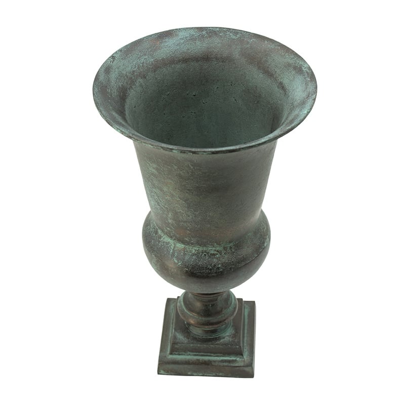 This metal vase has an intriguing Patina finish to achieve the look of an aged artifact.Sitting on a pedestal,the small vase features a tapered round body and wide opening.The vase makes for a stunning display in a living room or dining room.