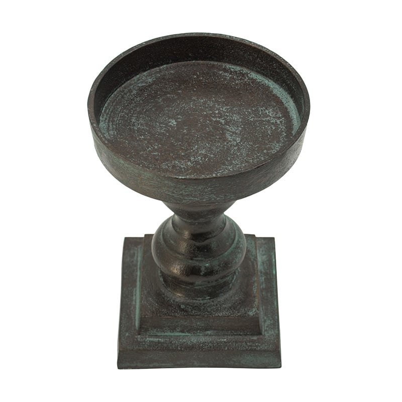 This metal pillar holder has a timeworn patina finish that compliments the traditional pedestal and square base design perfectly.Place this pillar holder on a dining table,mantel or console table for a handsome display.