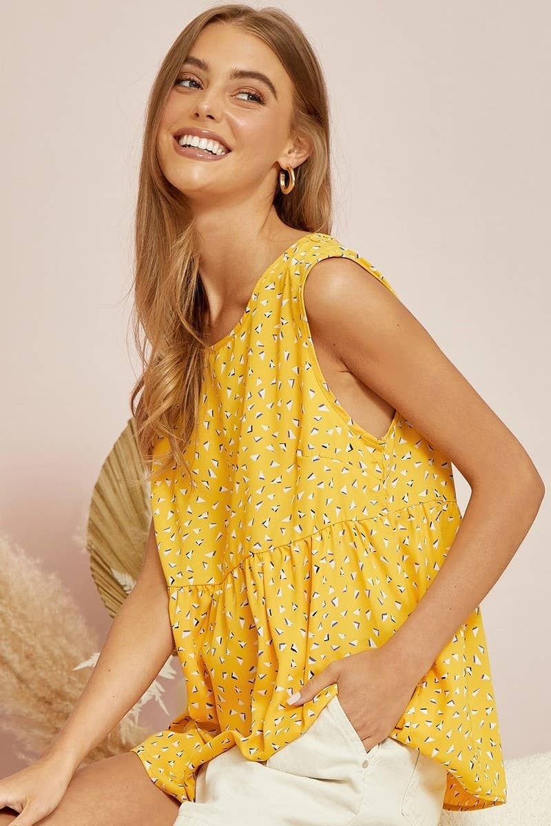 Sleeveless babydoll top with round neckline and flowy bodice! Easy fit, woven, non sheer.