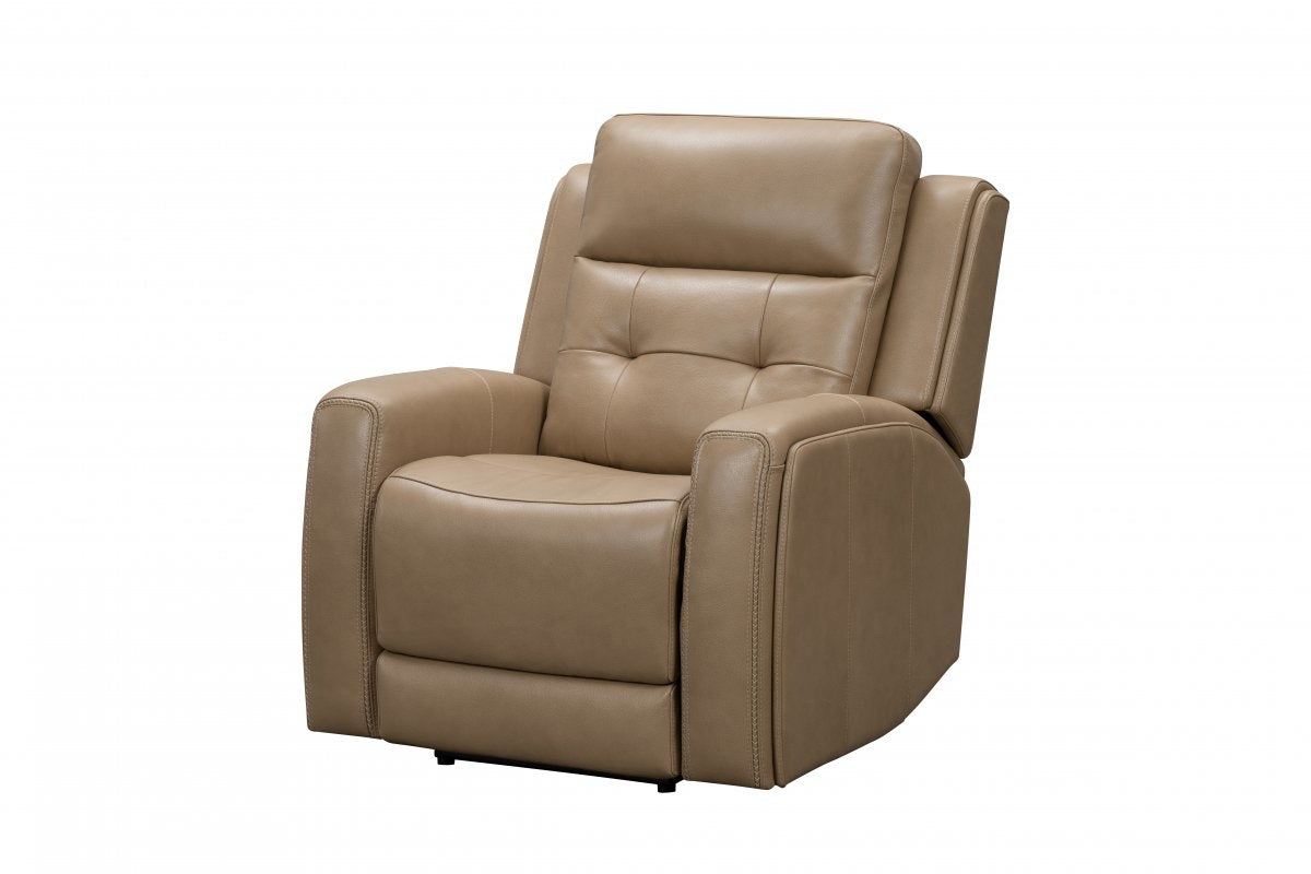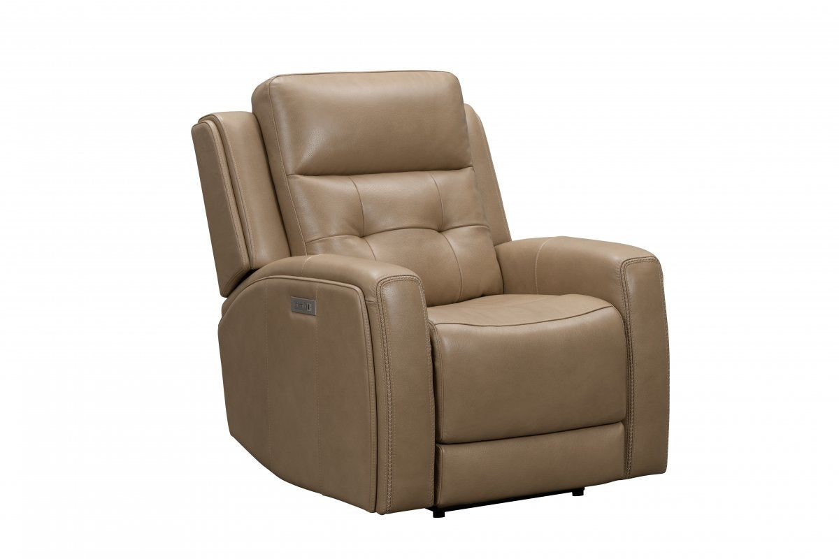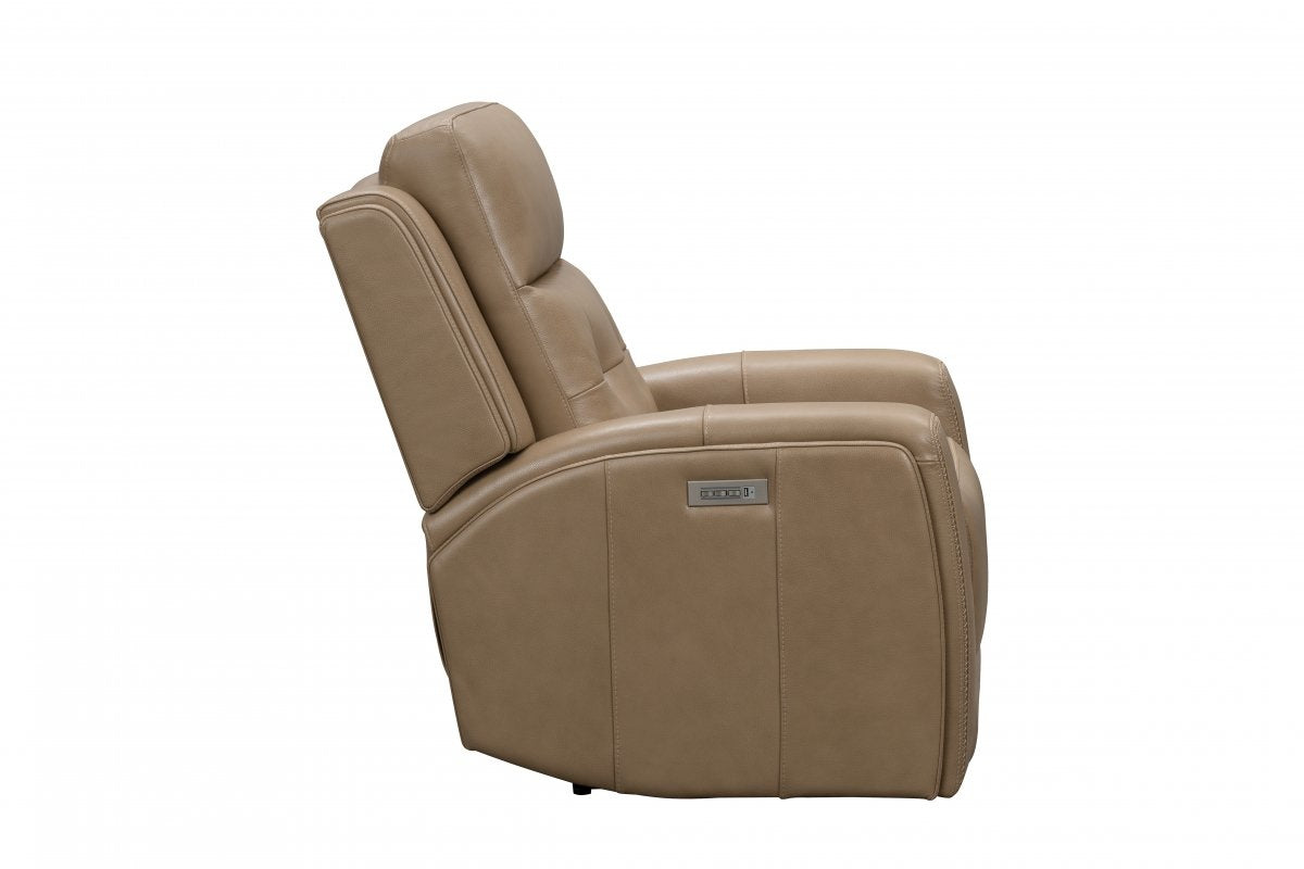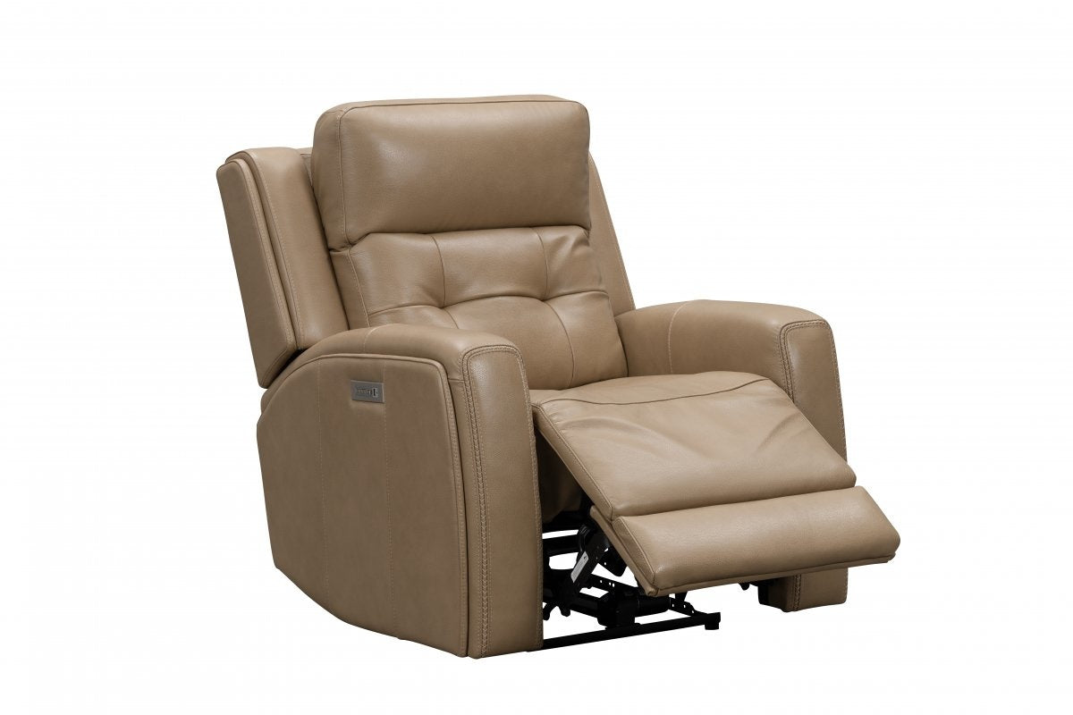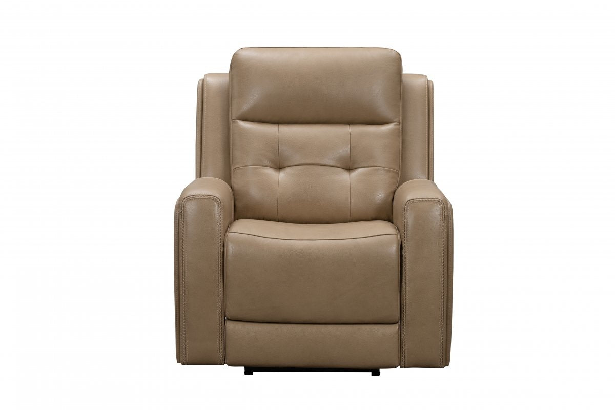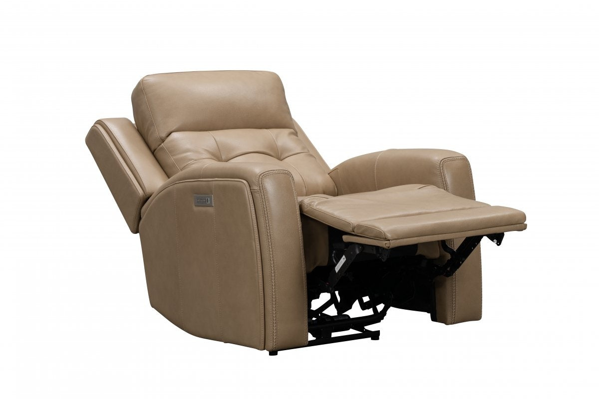 Features include plush winged pub back with buttonless tufts, whip stitching, shaped track arms, pad over chaise bucket seating with pocketed coil spring, and unique side panel. Outside arm controller with USB ports.