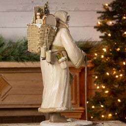 Embrace the elegance of our Santa dressed in a long white robe adorned with light brown trim. Carrying a basket brimming with toys on his back, he strolls gracefully, guided by a classic walking stick.