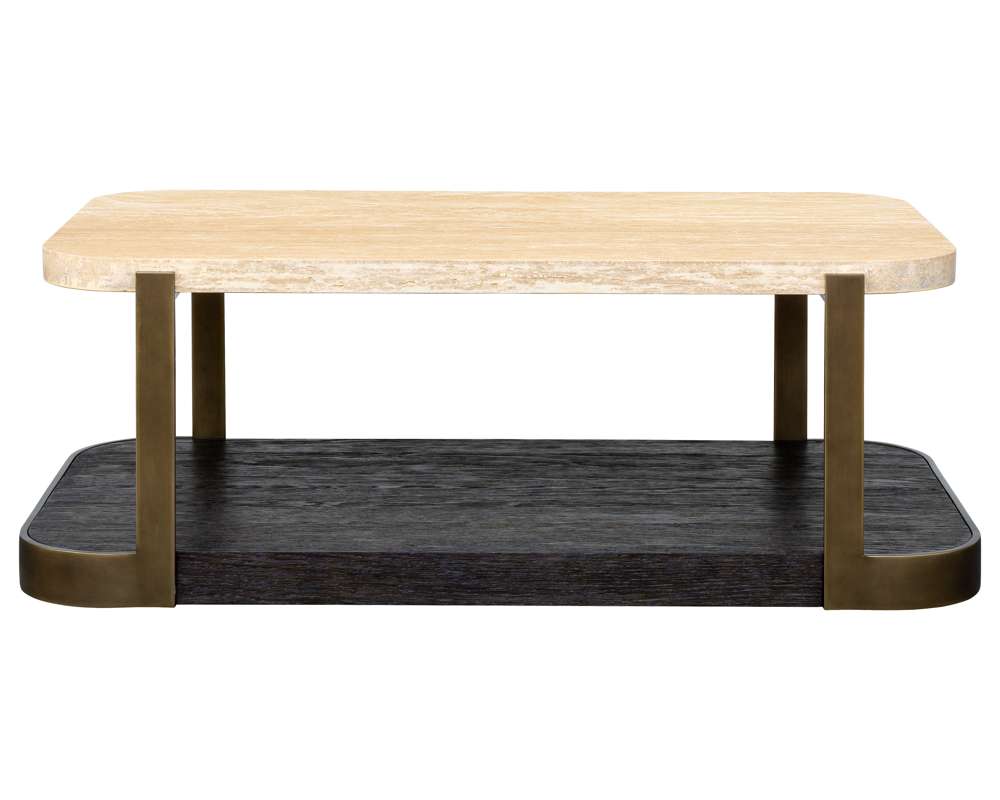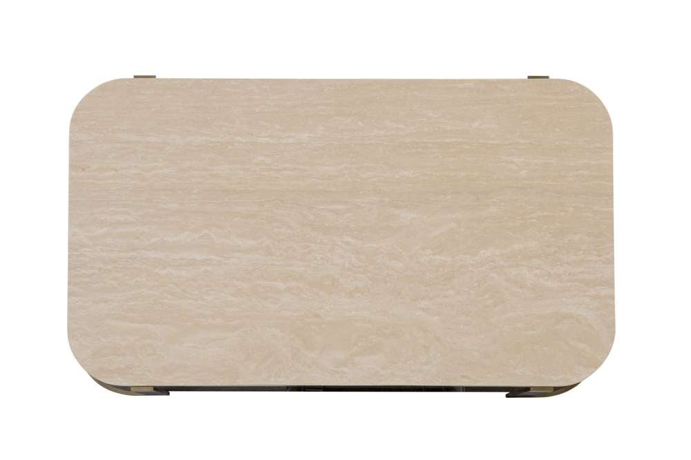 The Avalon Cocktail Table embodies a seamless blend of modern and contemporary elements, exuding sophistication and timeless elegance. Crafted with a trio of mixed materials, including beige travertine stone for the top, a bronze-finished metal frame, and an espresso oak-finished bottom shelf, this piece adds a touch of luxury to any space. As travertine is a porous natural stone, each table boasts unique variations in veining and color, ensuring its individuality. With its modern-luxe design and meticulous attention to detail, the Avalon end table is a testament to exquisite craftsmanship and refined taste, making it a versatile addition to any home decor scheme.