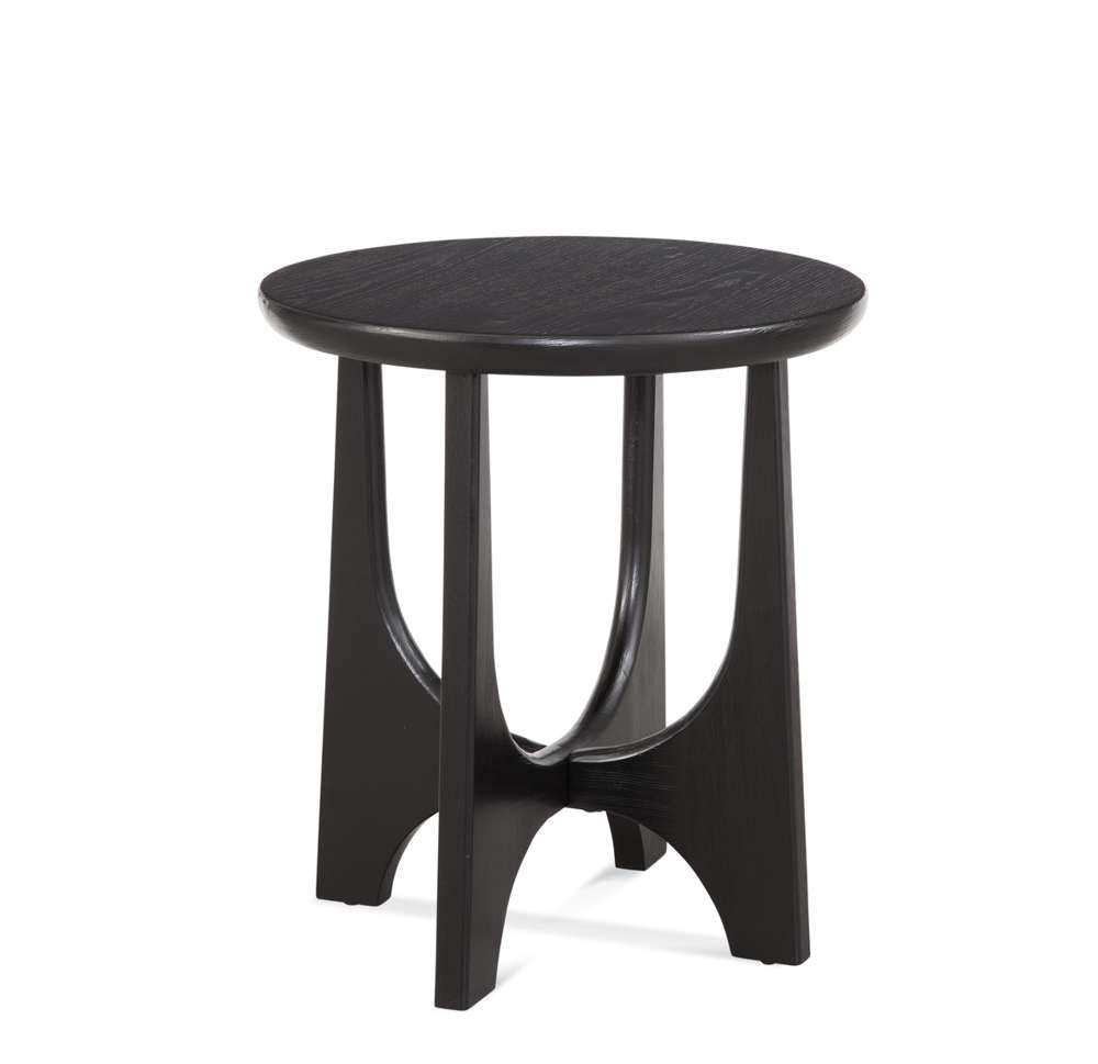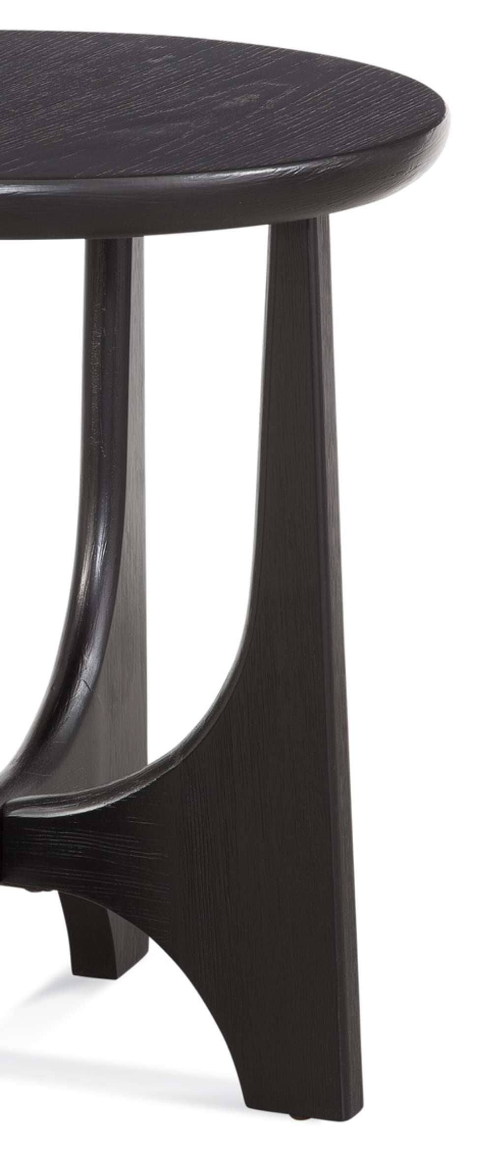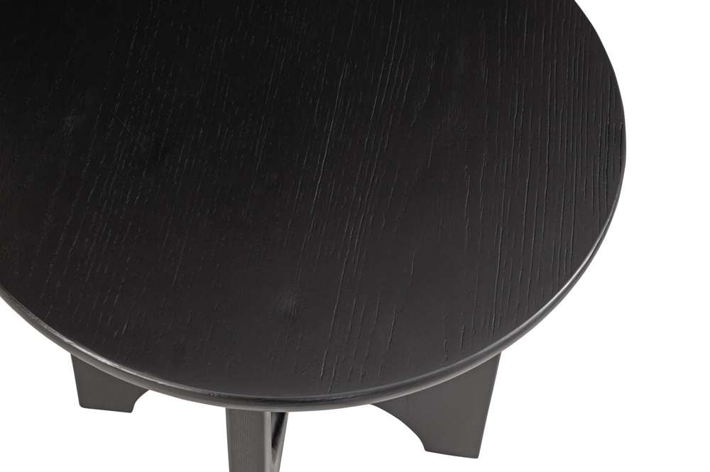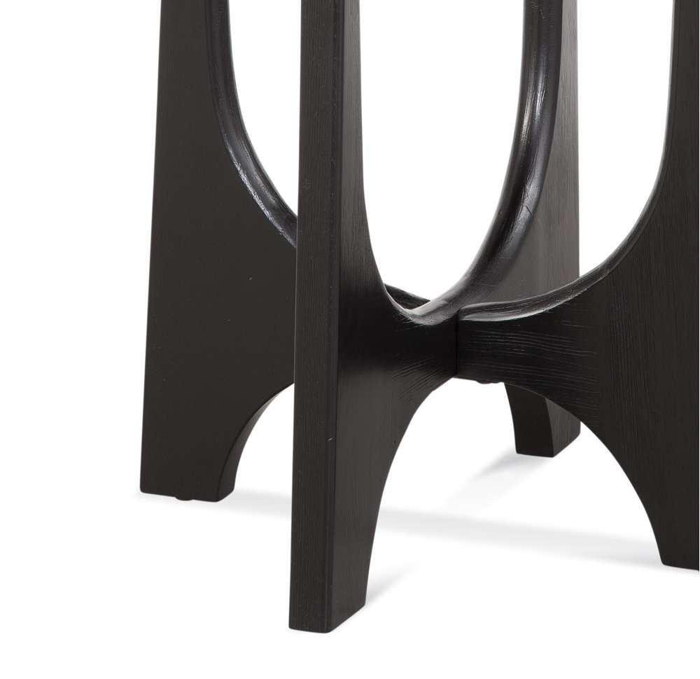 The Dunnigan End Table features modern styling with an organic architectural inspired design. The flat-cut oak wood is finished in a black matte stain. The base design features curving on the inside and straight on the outside for a unique look. Also included are adjustable floor levelers for an even balance.