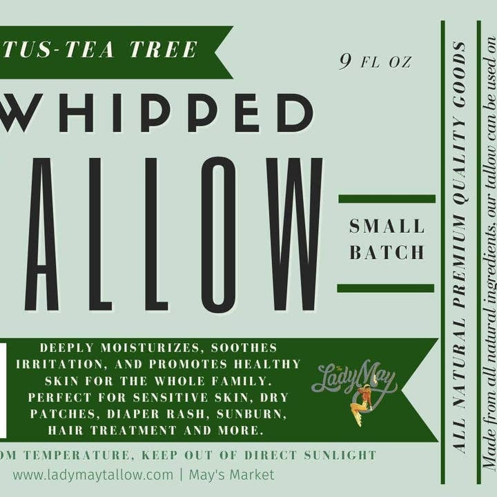 Lady May Eucalyptus Tea Tree Whipped Tallow, a luxurious, all-natural moisturizer made from grass-fed beef tallow. Whipped to a soft, airy texture, it deeply hydrates, soothes irritation, and promotes healthy skin.