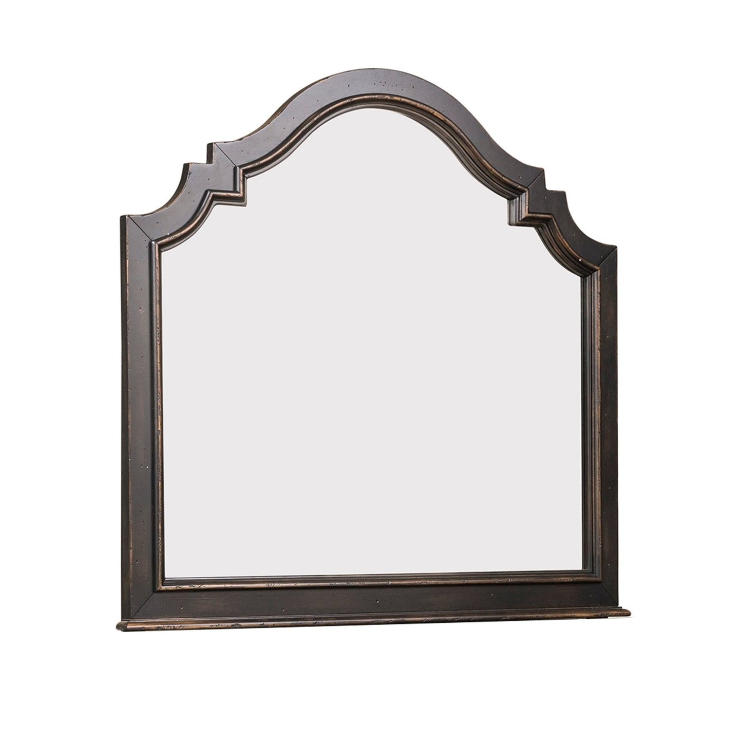 The antique black finish features wire brushing and heavy rub-through, adding a classic and fresh touch to the piece. This piece features a beautiful scallop shaped crown, effortlessly adding dimension.