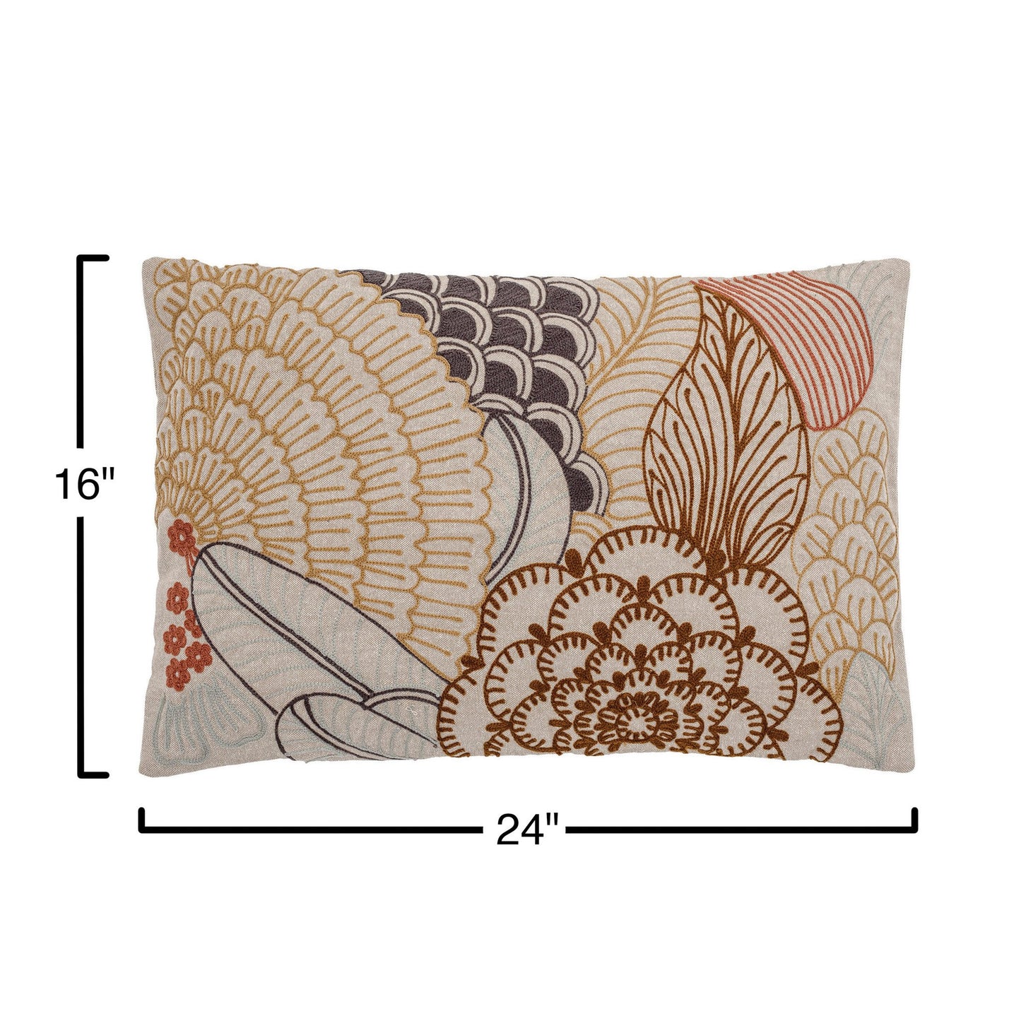 This unique pillow is the perfect addition to any chair or couch. It is cotton lumbar and has gorgeous floral embroidery detail.