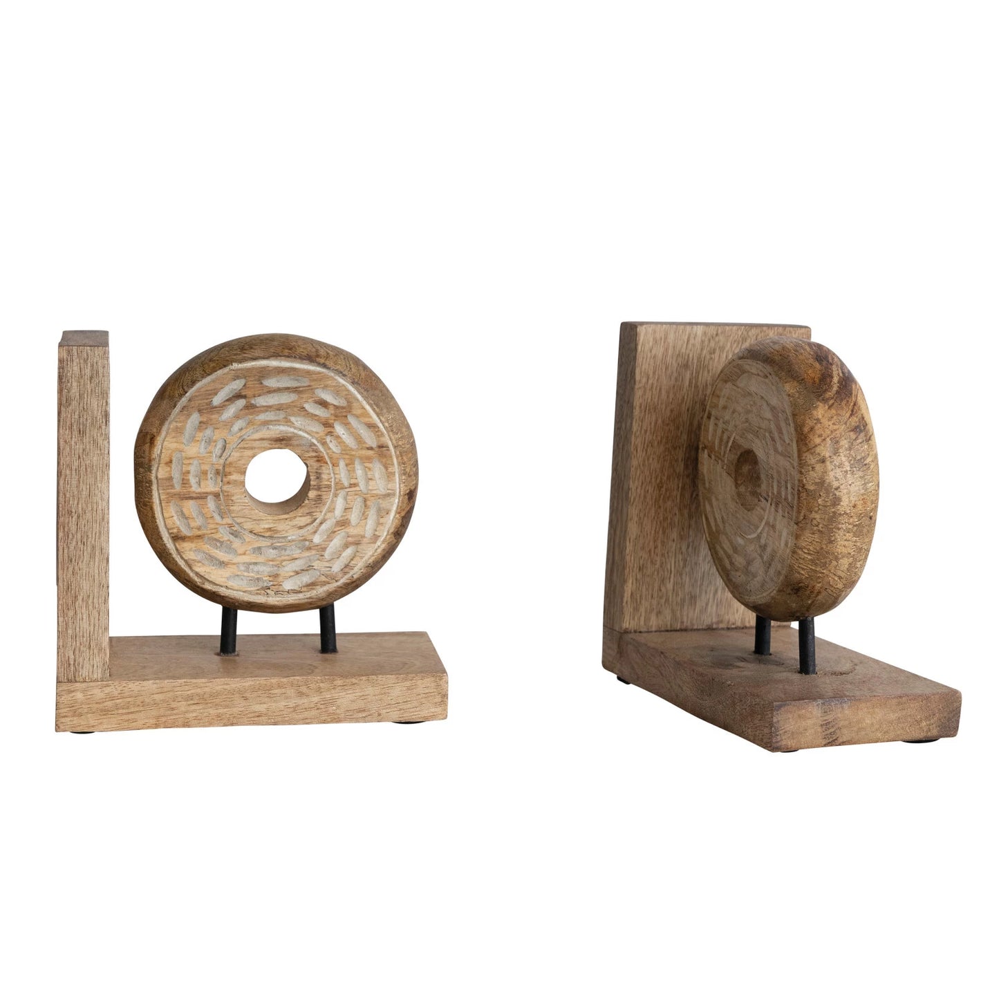 The bookend feature a stylish metal circle accent that not only adds a modern and industrial touch but also provides sturdy support to keep your books neatly organized. The combination of mango wood and metal creates a striking visual contrast.
