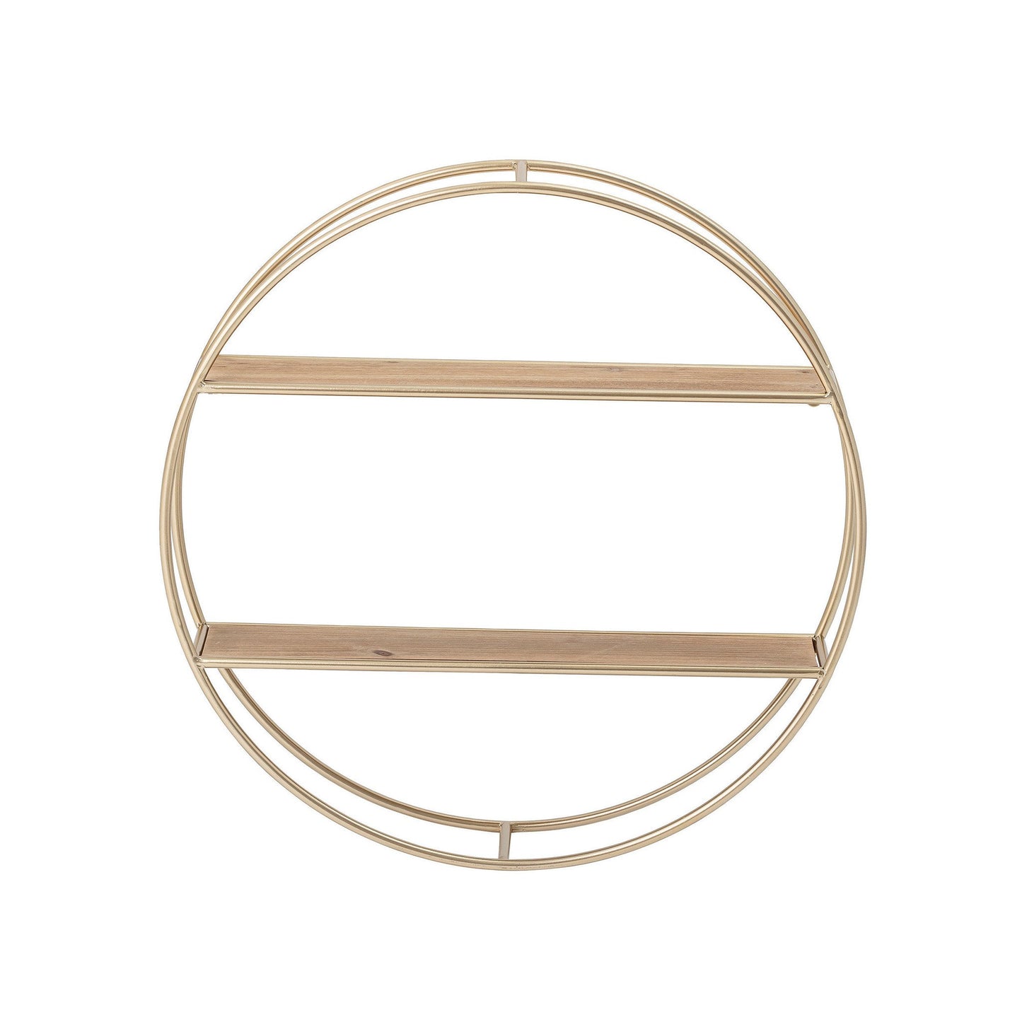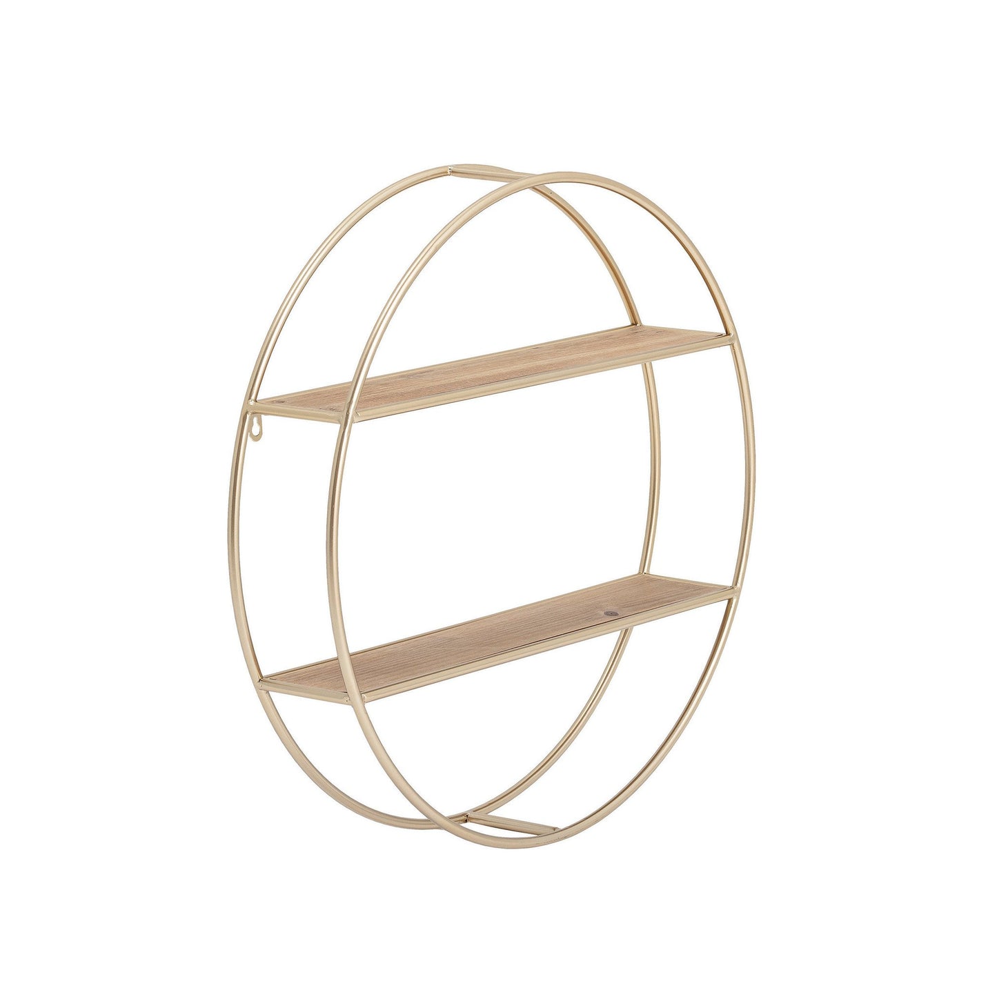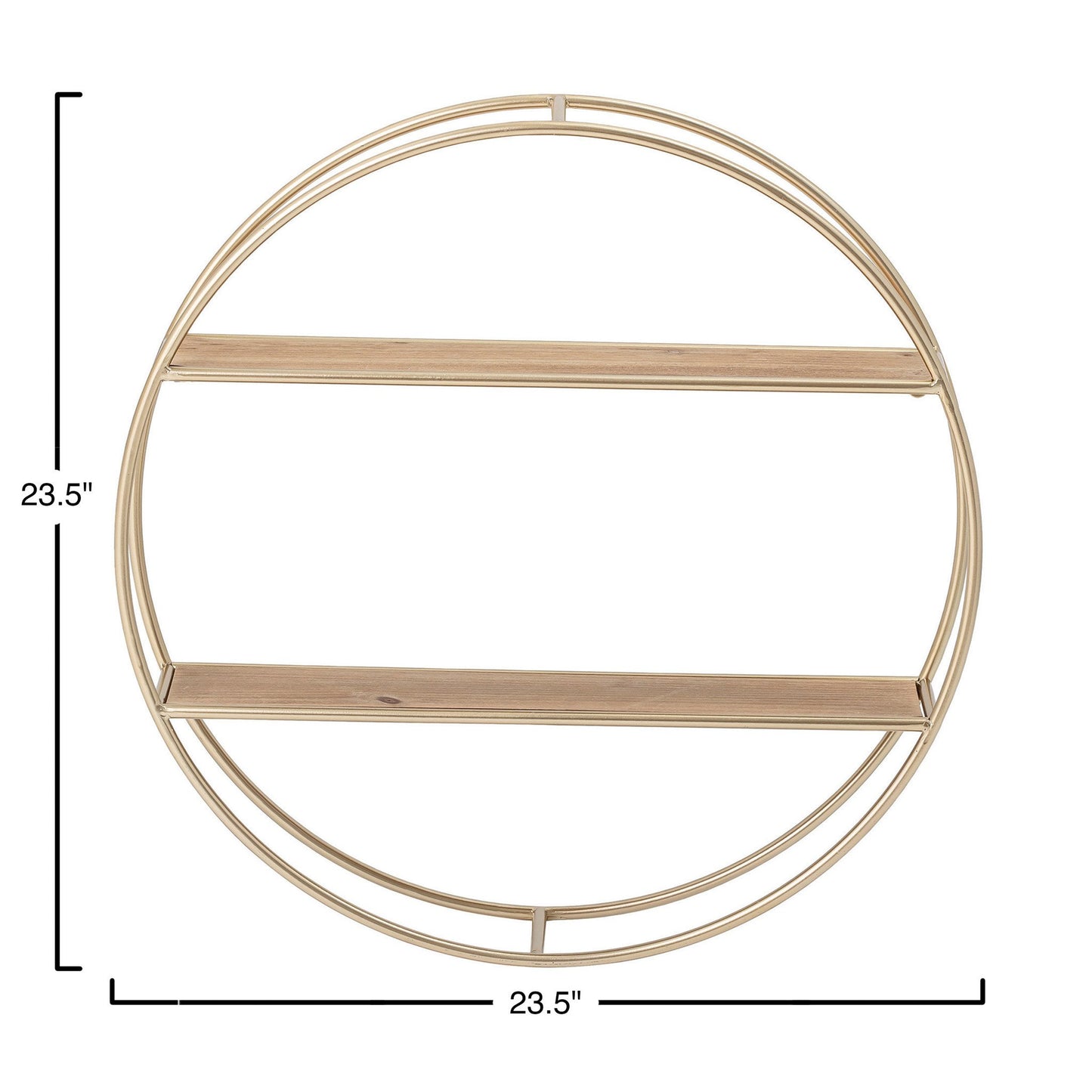 At 23.5 inches in diameter, this circular shelf adds variety and dimension to a typical wall display. The metal circles envelop two shelves for a unique and modern look that will bring empty walls to life!