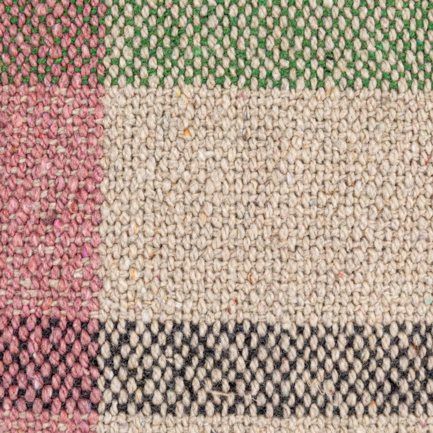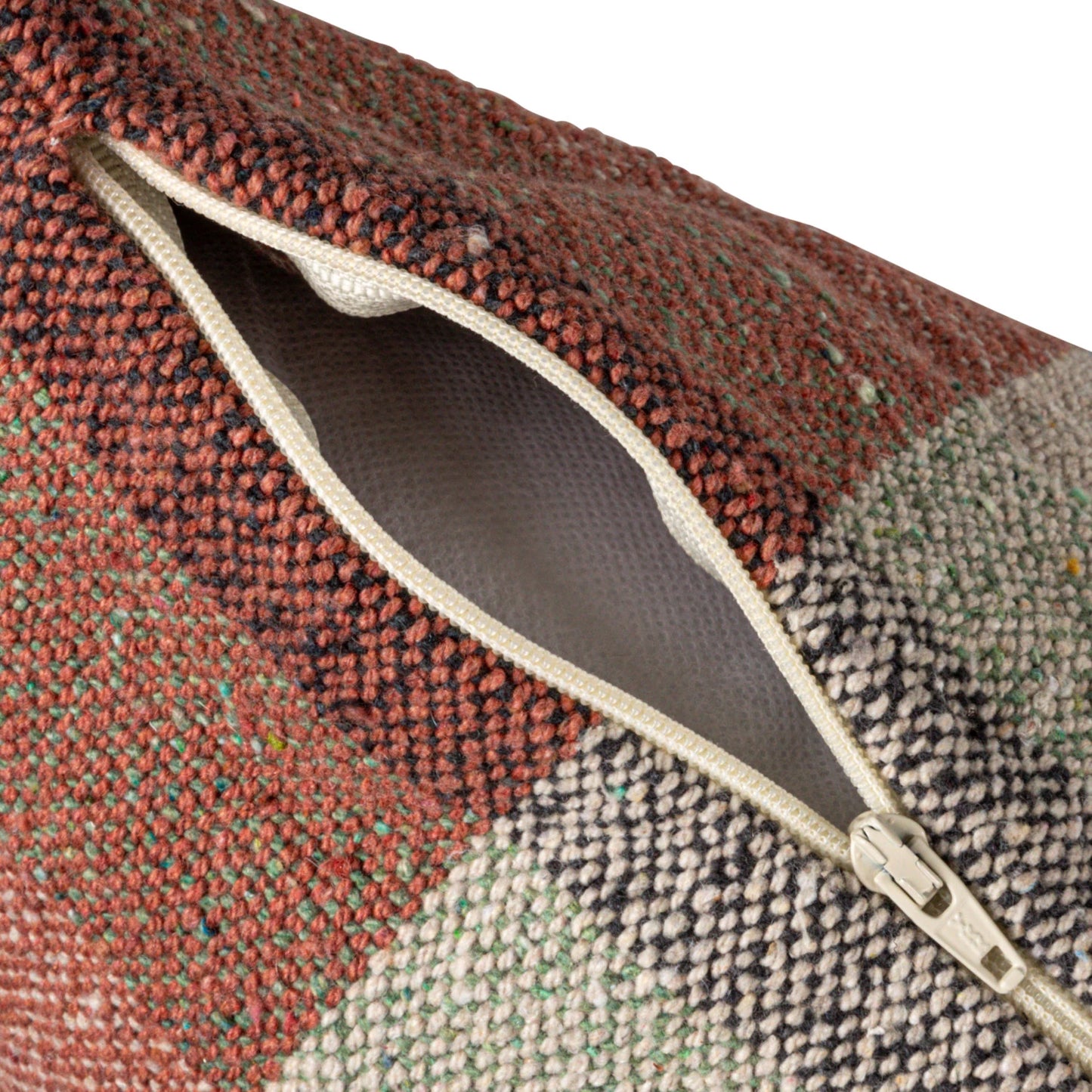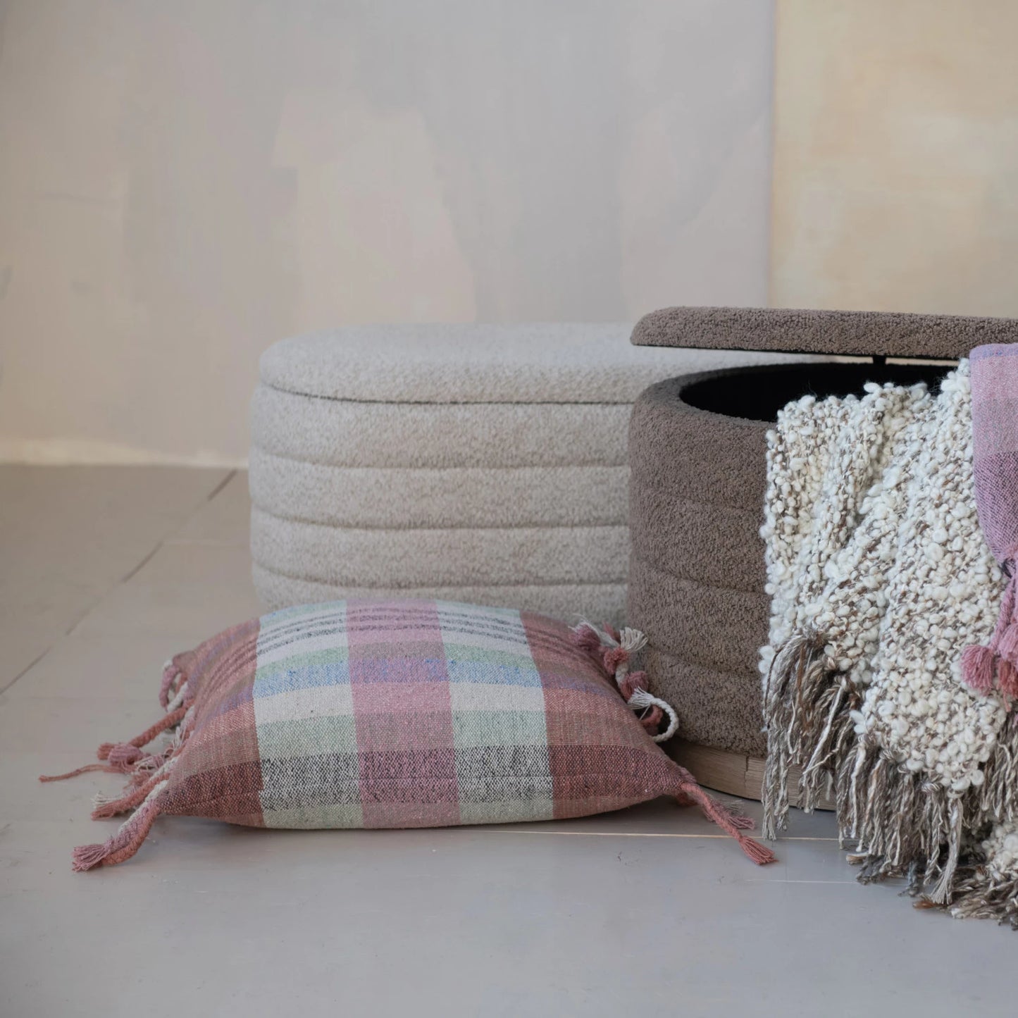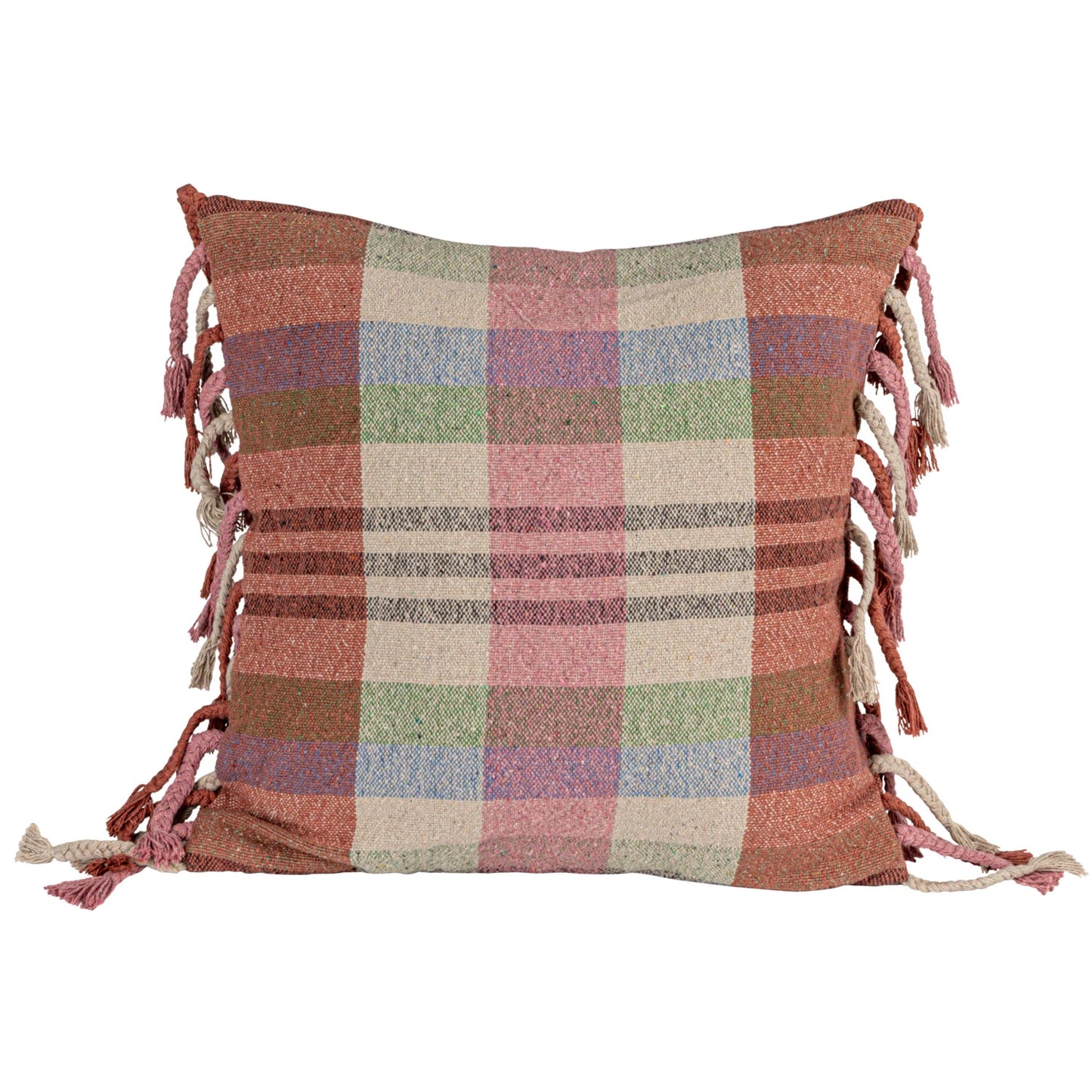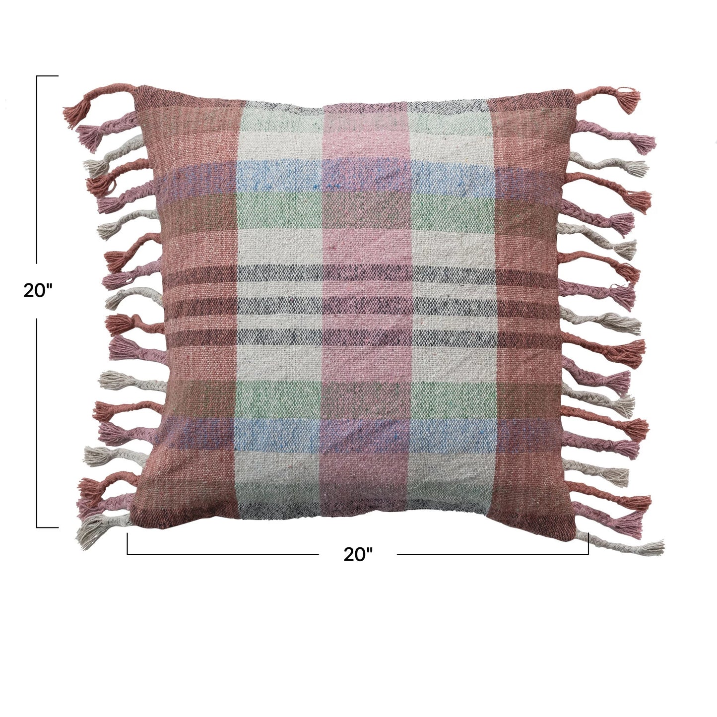 20" Square Woven Recycled Cotton Blend Pillow w/ Braided Fringe, Multi Color Plaid