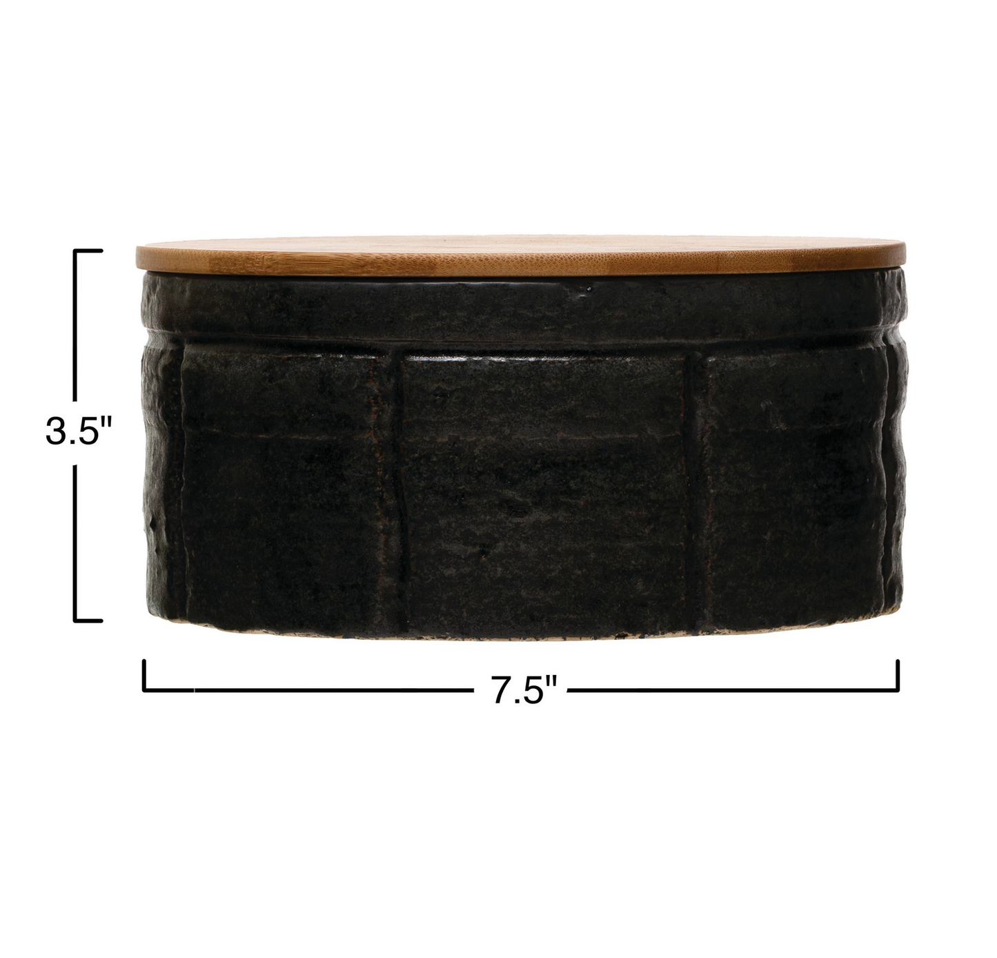 This beautiful stoneware canister is perfect for any style home. It can be used for storing small items or food. Its unique reactive glaze really helps it make a statement piece for any kitchen, and it has an attached bamboo lid.