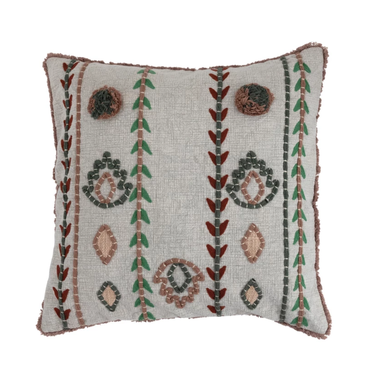 Embroidered Cotton Pillow with Chambray Back and Fringe
