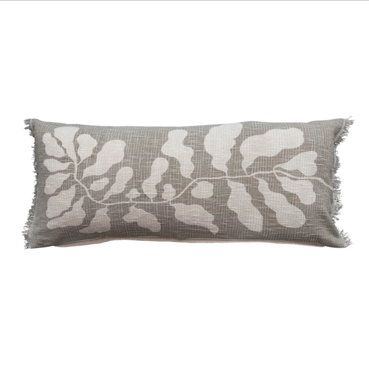 Cotton Lumbar Pillow w/ Botanical Print & Fringe, Sage Color & Natural