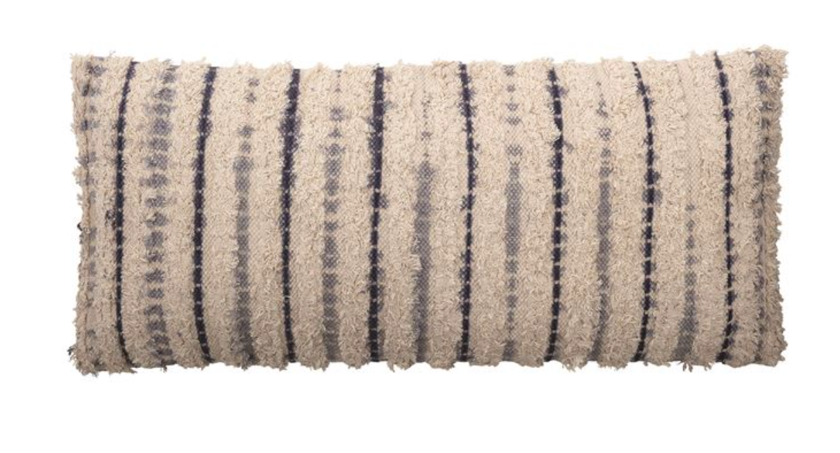 Woven Cotton Textured Lumbar Pillow with Tie-Dyed Stripes, Blue & Natural