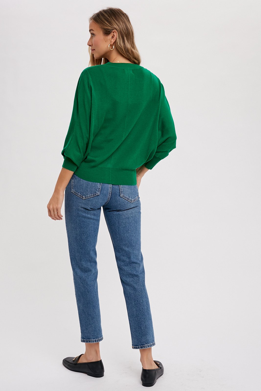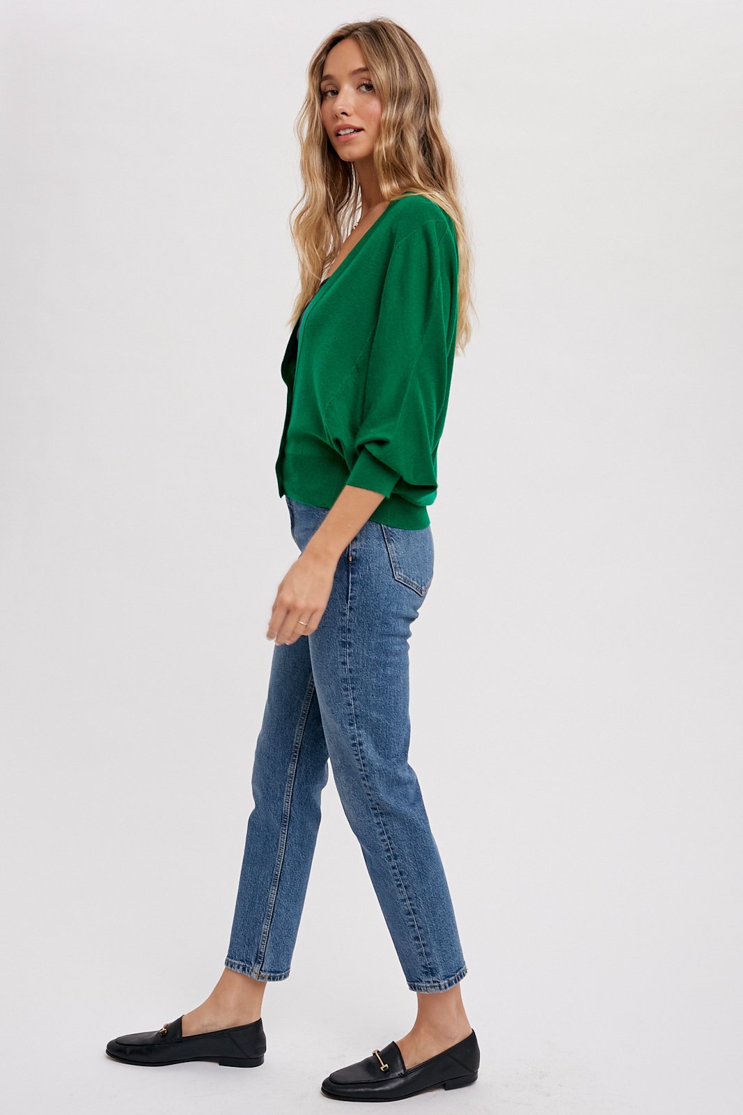 Knit cardigan featuring a button front, 3/4 dolman sleeves, ribbed hemline and a relaxed fit, extra soft and luxurious feel.