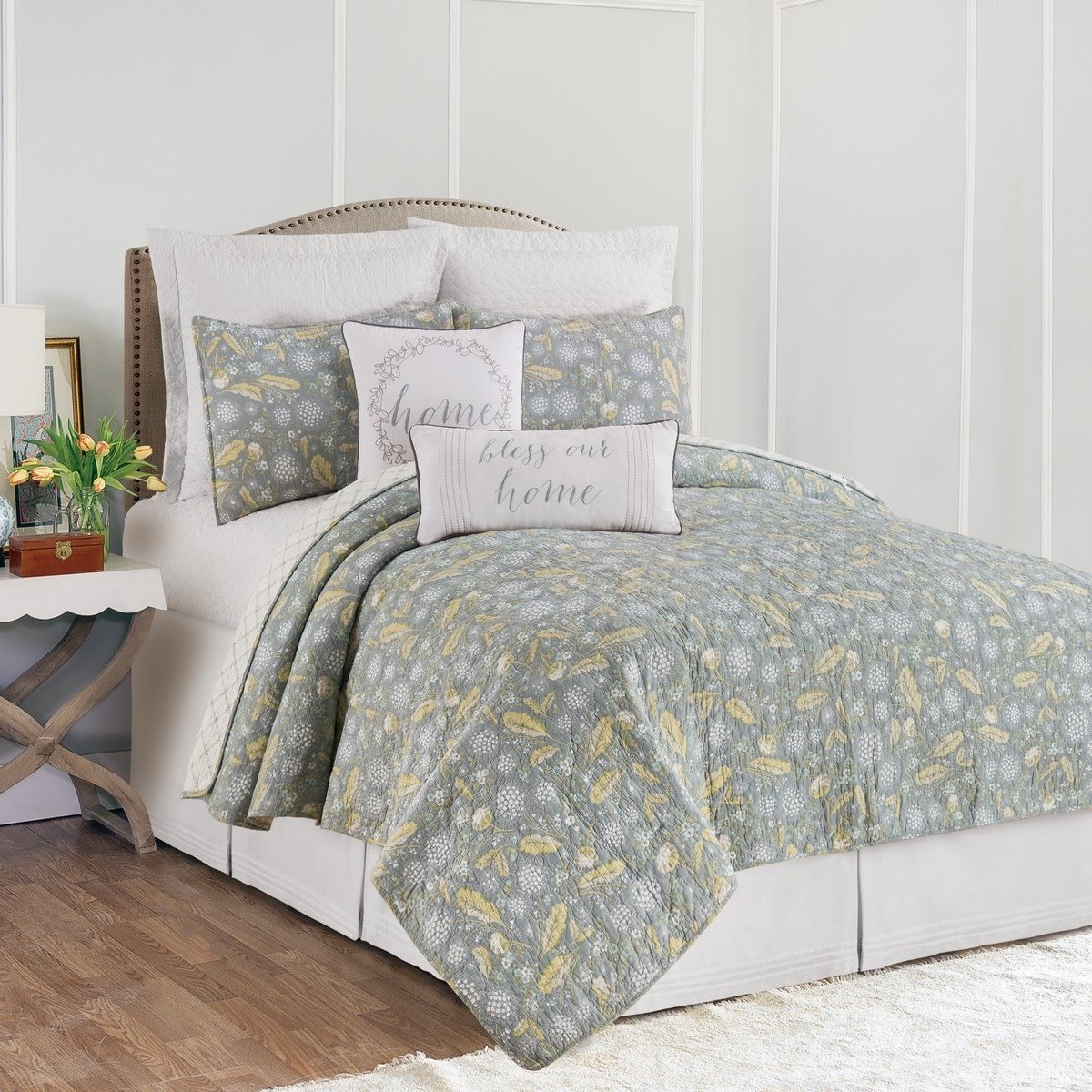 Traditional and ever-beautiful, the Dandelion Court Quilt Set lends a classic element to your bedroom. Designed in collaboration with WILLIAMSBURG, this charming bedding set is inspired by an 18th century silk jacket from the WILLIAMSBURG archives. Featuring delicate dandelions, florals and leaves atop a tranquil slate blue ground. Reverse to a simple lattice pattern for additional styling options. Pair with our Regent Soft White Euro shams and our White Tailored bed skirt for the finishing touches. Crafted of cotton and machine washable for easy care. Accent pillows, euro shams and bed skirt sold separately.