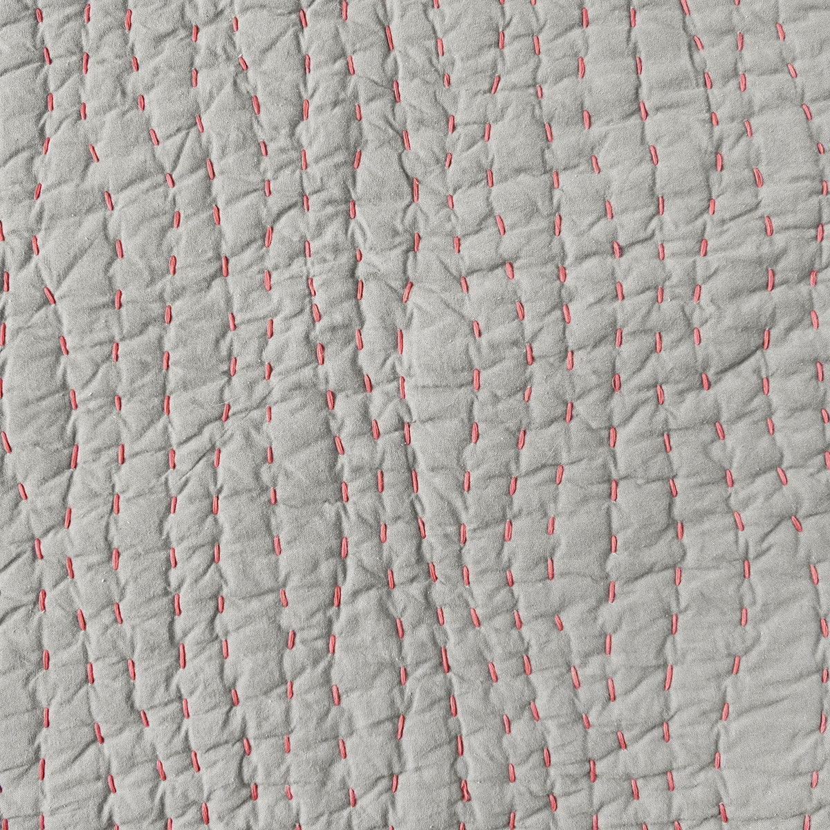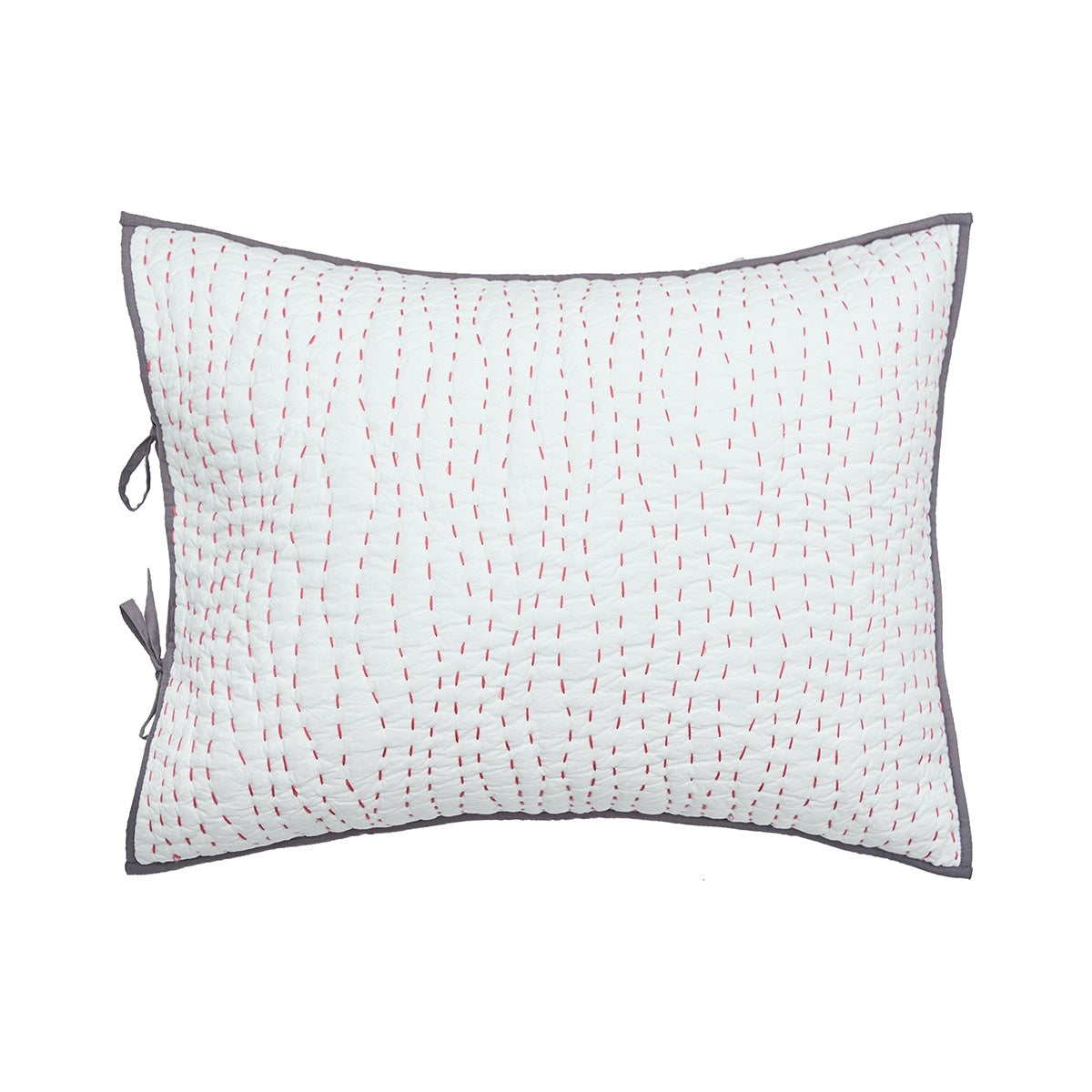 The reversible polly standard sham is a beautiful gray quilted sham with pink stitching on one side and white with pink stitching on the other. 20" x 26"