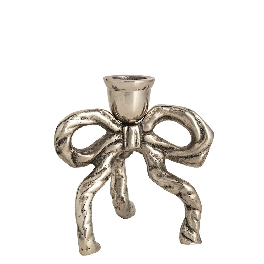 The intricate bow design adds a charming detail, while the sturdy metal construction ensures durability and stability. Ideal for holding standard taper candles, this holder is a versatile accessory that enhances the ambiance of any room with its timeless appeal.