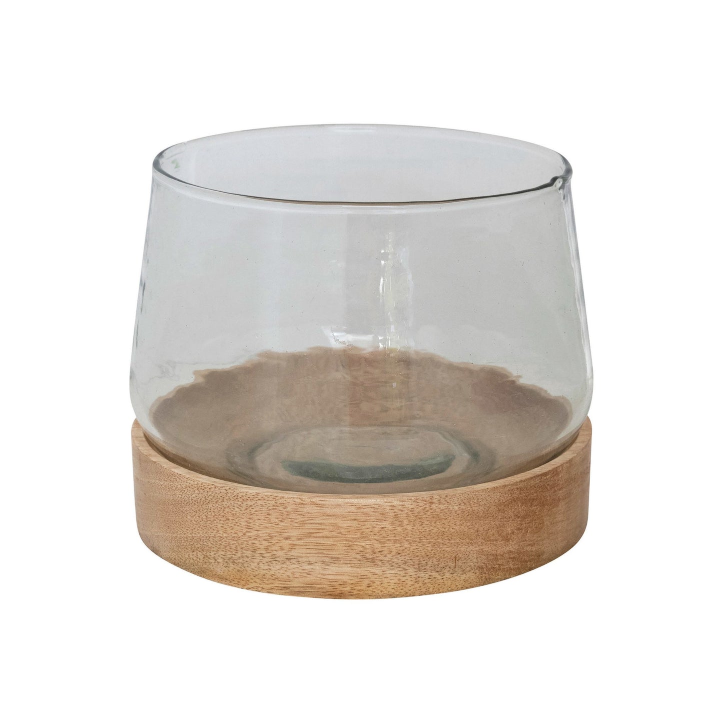 Glass Hurricane/Vase with Mango Wood Base, Set of 2