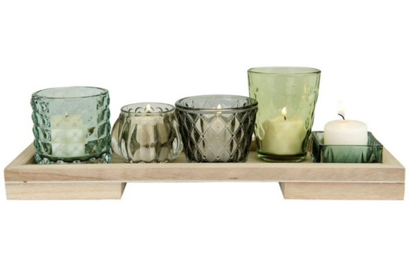 Wood Tray w/ 5 Glass Votive/Tealight Holders, Boxed Set of 6