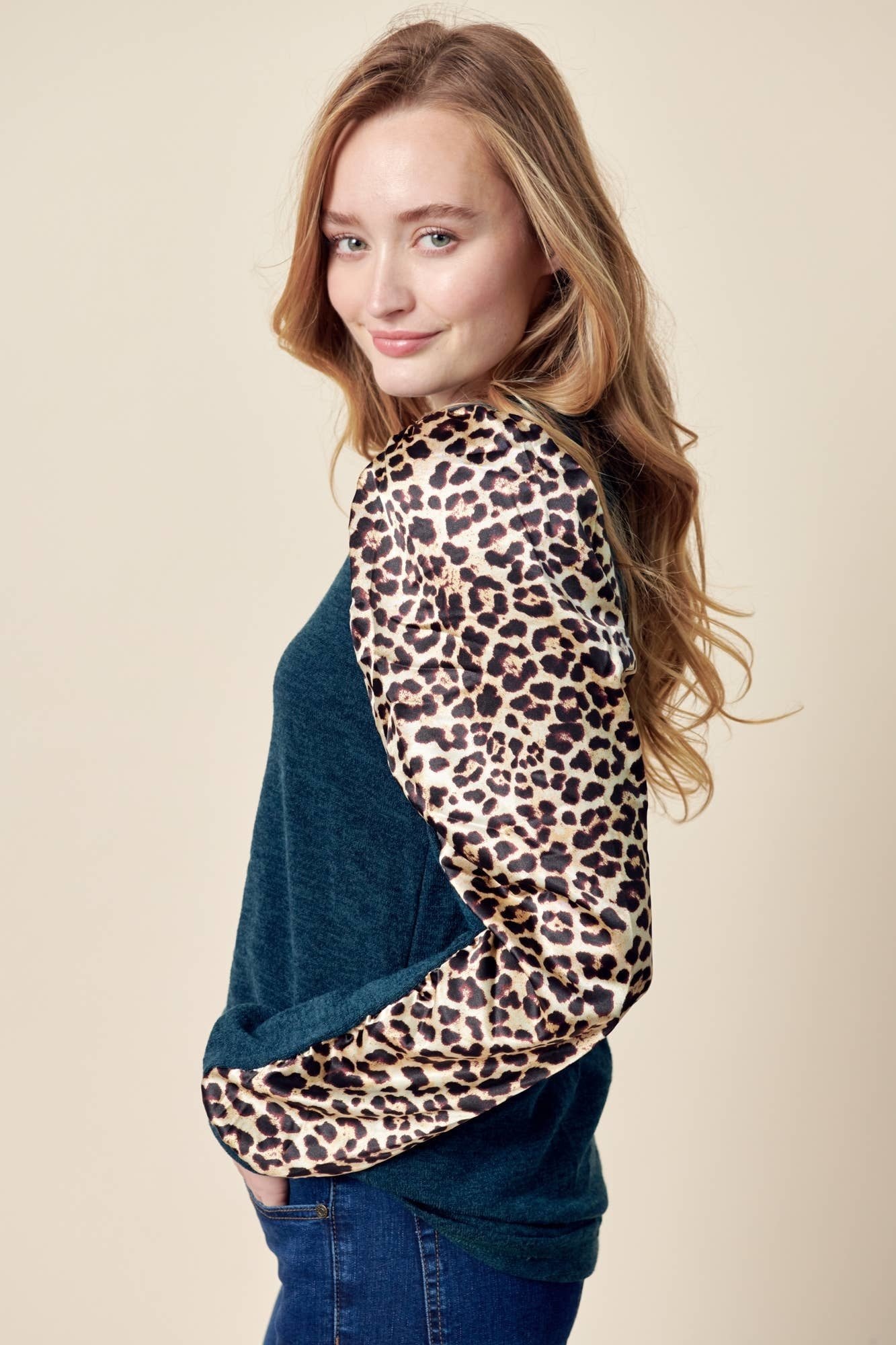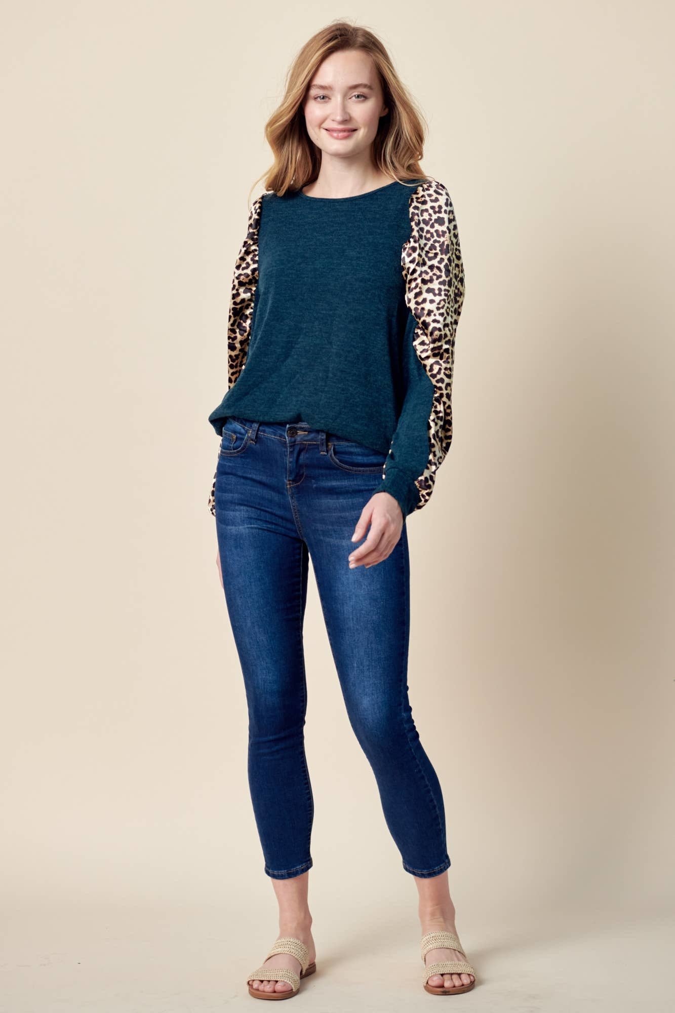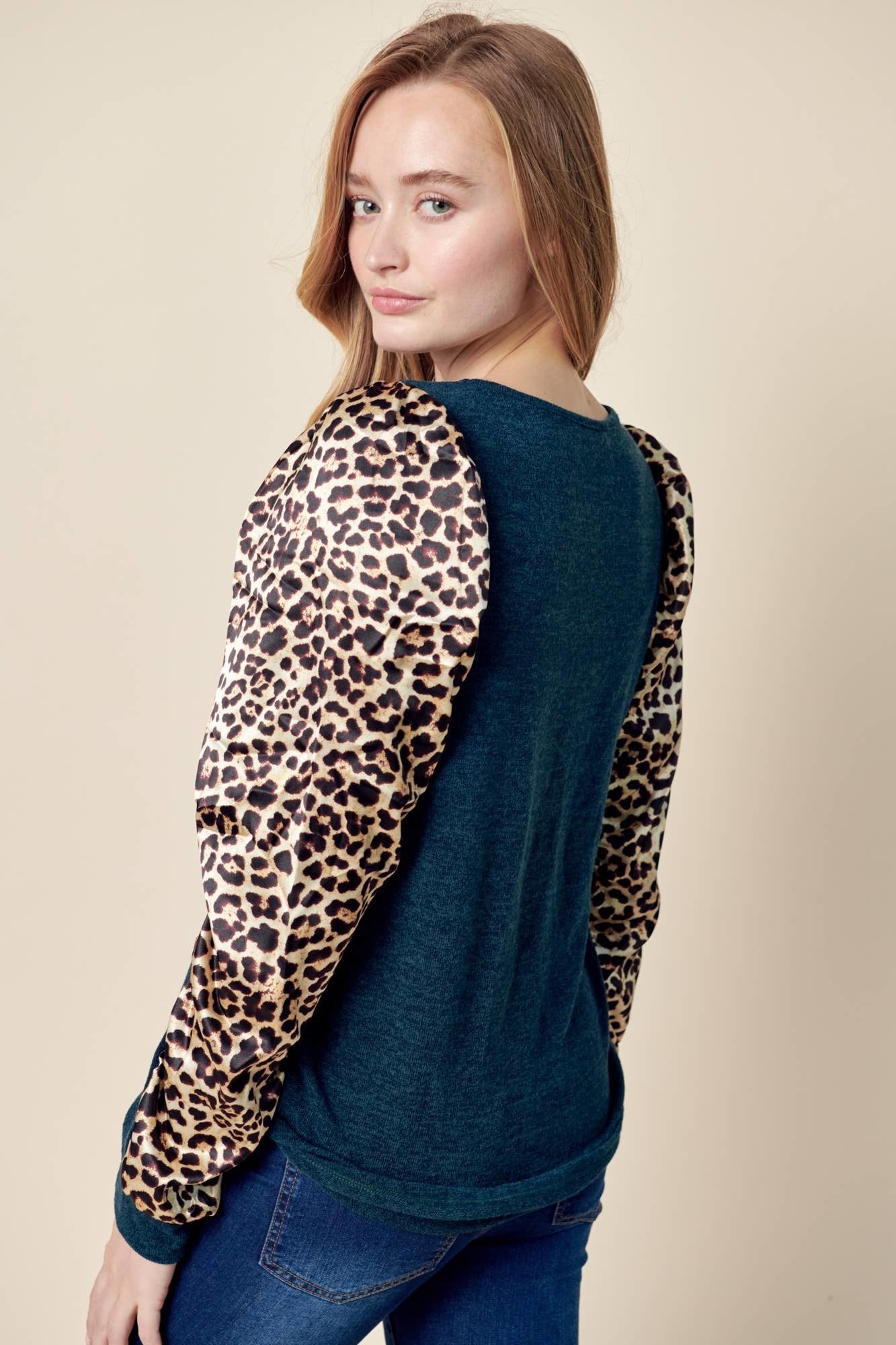 Animal print and two tone knit fabric color block top, Features long sleeve, round neck, shirring detail shoulder, tunic length.