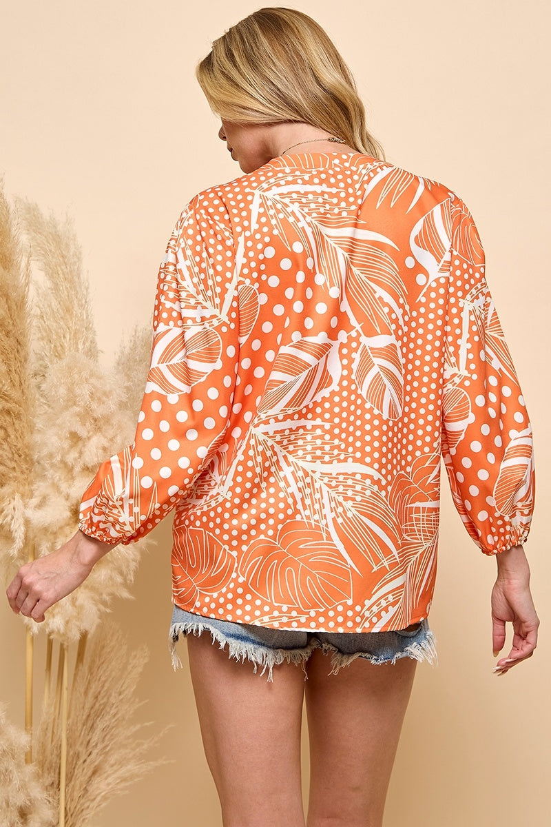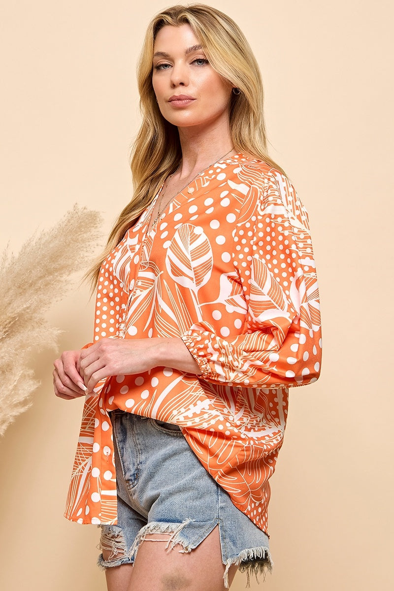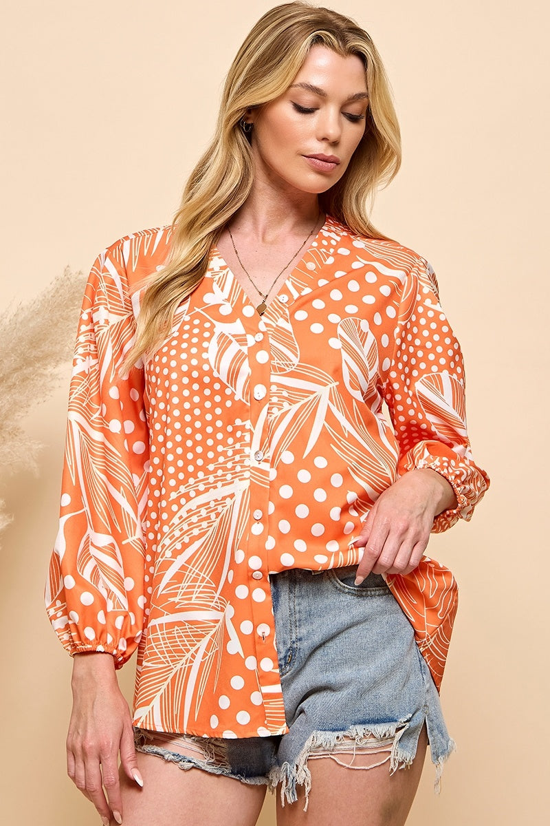 This casual orange print top combines vibrant color with effortless style. Designed with a convenient button closure, it offers both comfort and easy wear. Perfect for everyday outings, this medium-sized top adds a fresh, lively touch to your wardrobe.