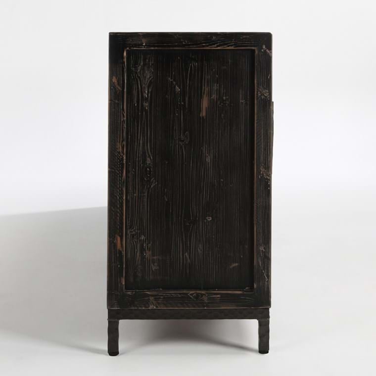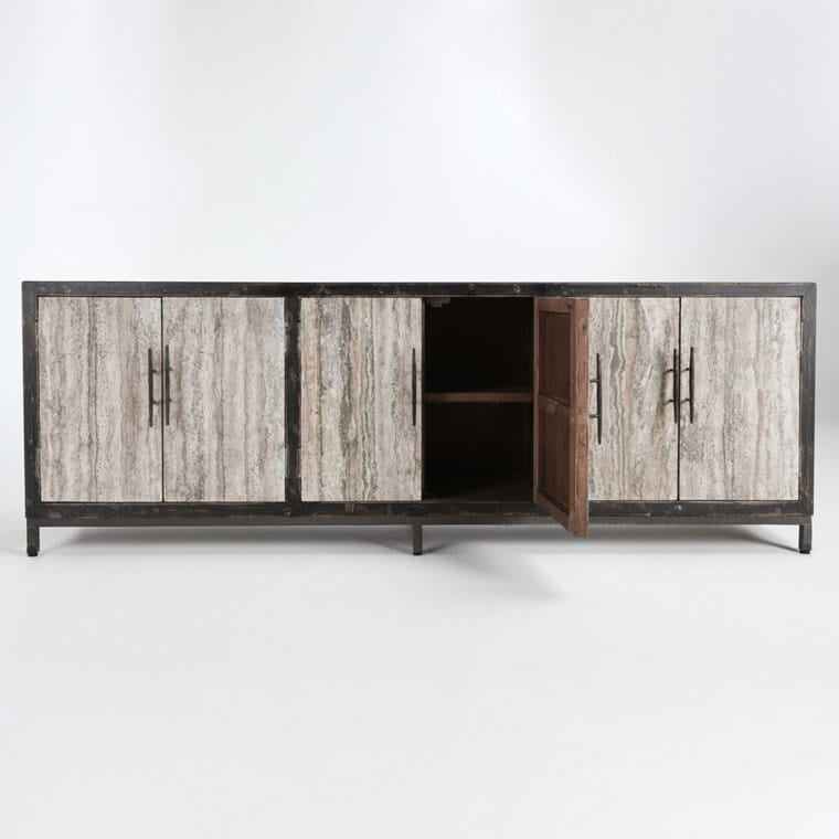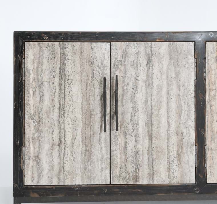 Smooth travertine doors contrast against the reclaimed pine wood frame of this handsome sideboard. We hand select every piece of travertine, choosing them for their unique colors and veining patterns.