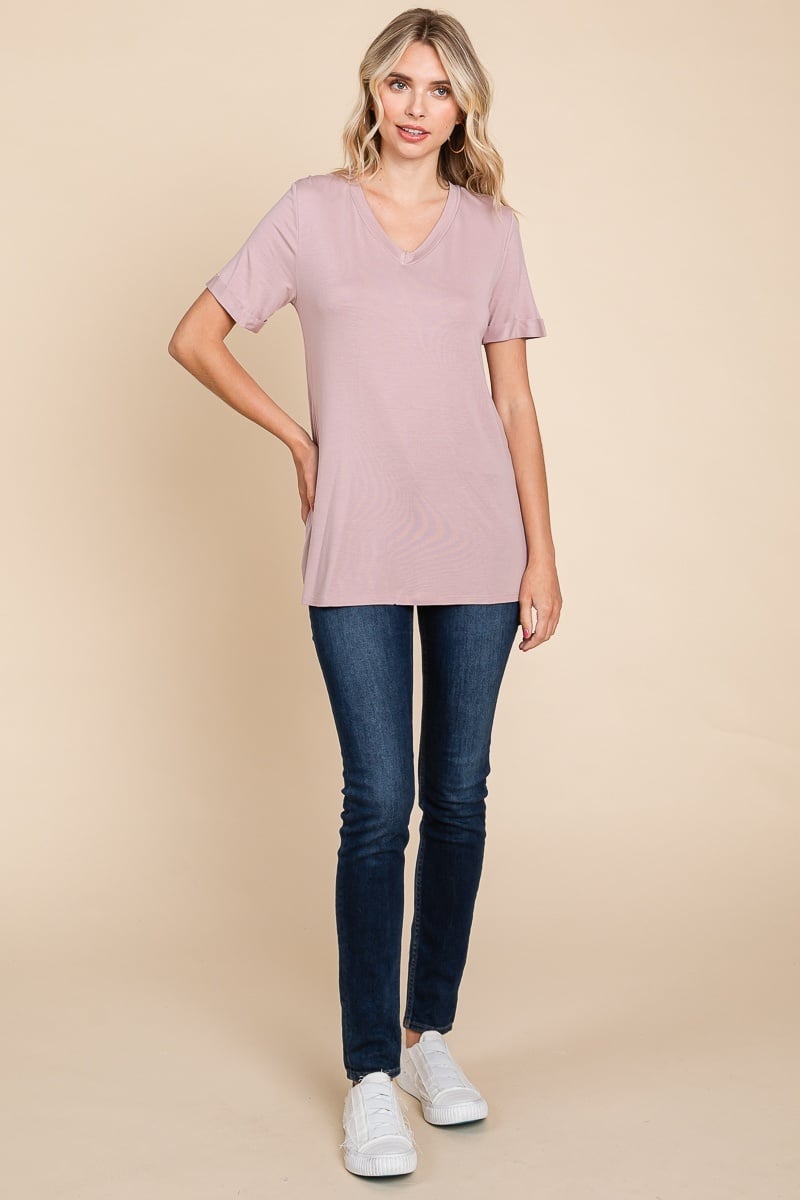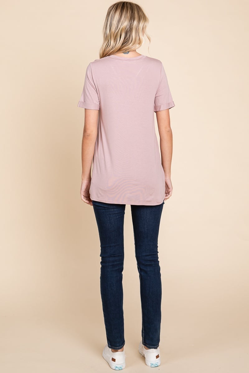 Solid V-Neck Roll Up Short Sleeve Top - Dusty Mauve