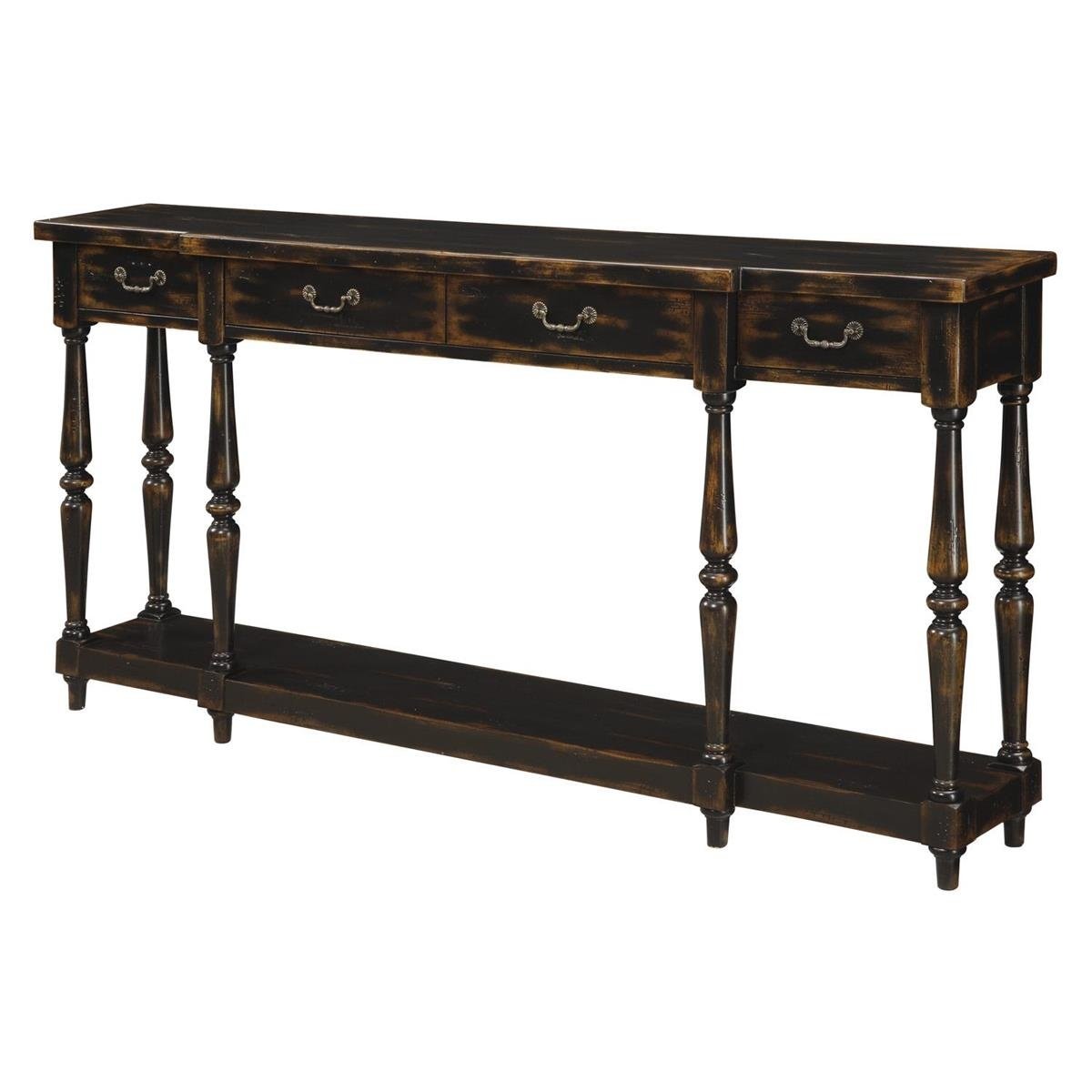 With a breakfront design, this console has a beautifully done Apperson Black finish with a rub through look for added interest. There is lots of storage in the four drawers and plenty of display space on the open shelf below.