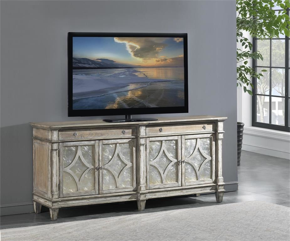 The four door fronts have a shimmery aspect, and are fronted with a raised diamond overlay. Two drawers above are deep and roomy, as is the shelved interior where you will also find a built in cord management system. A beautiful addition for any decor.