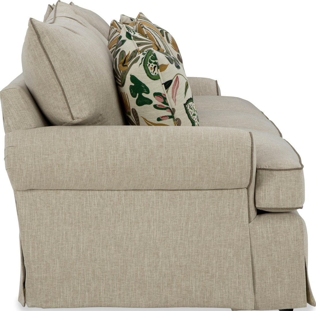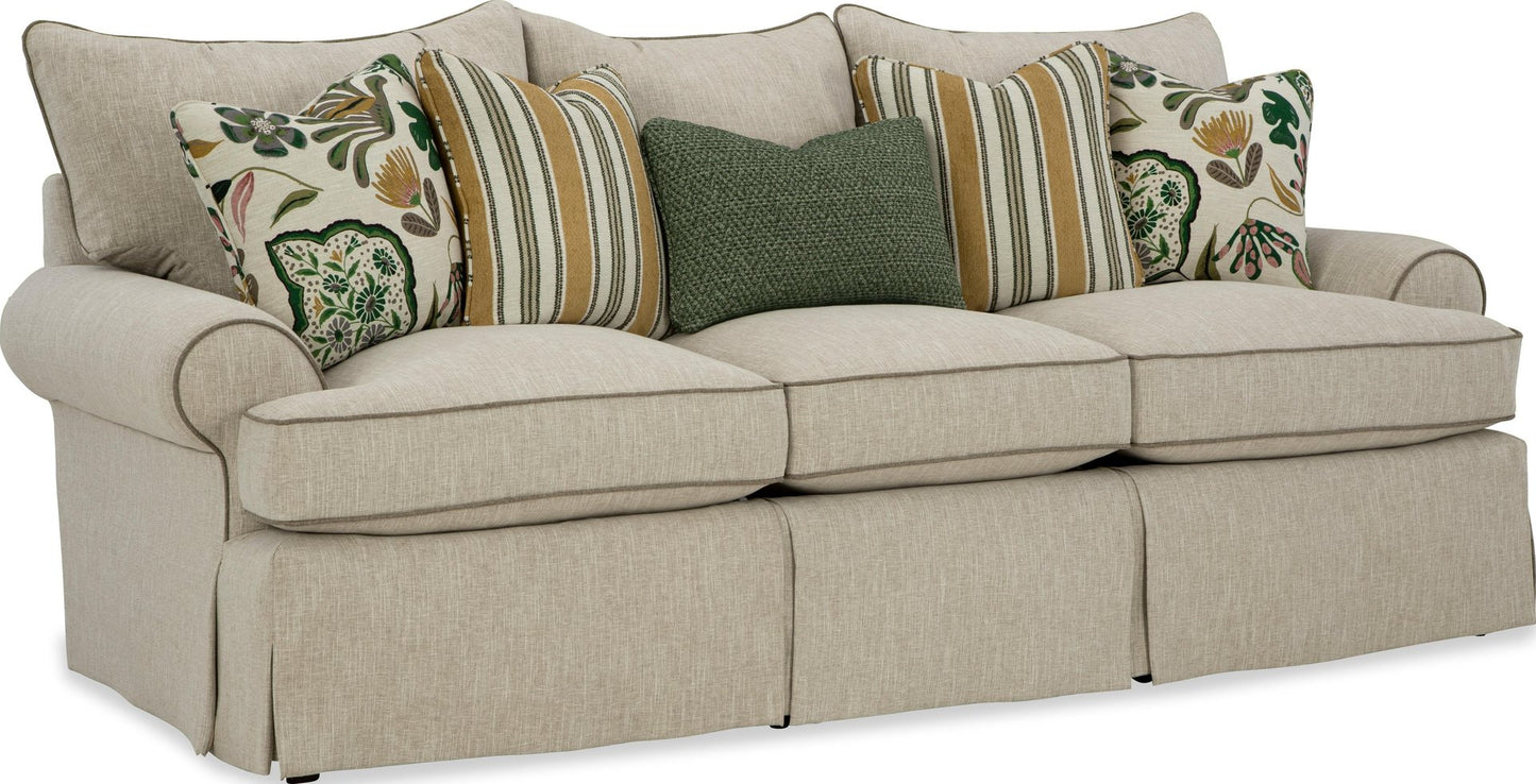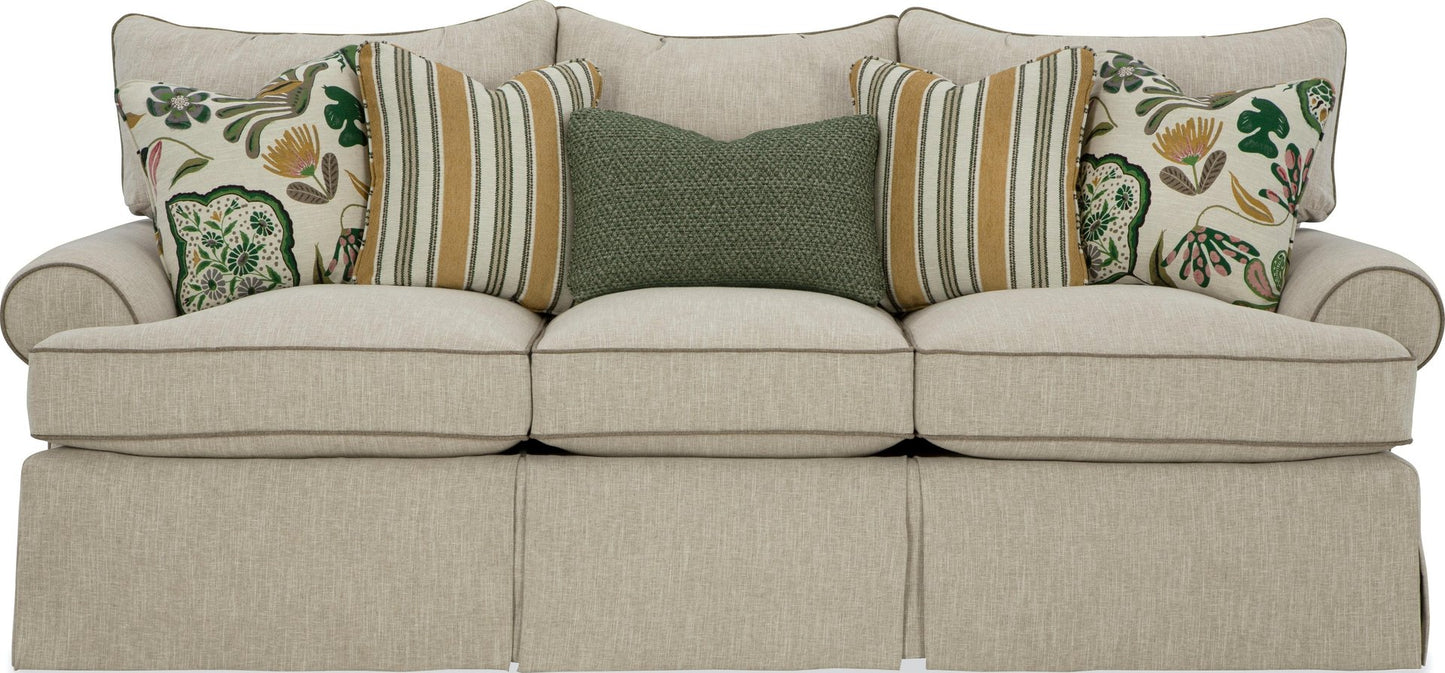 It's easy to make room for everyone on this 100'' sofa from the Paula Deen Home collection! This sofa is our best seller, and you can see why. It's built for comfort, with 3 plush loose pillow backs, 5 accent pillows, and Paula's exclusive Down Blend seat cushions. This style features sock arms, a high waterfall skirt and all the comforts of home! Also available are the matching loveseat, chair 1/2, and ottoman.
