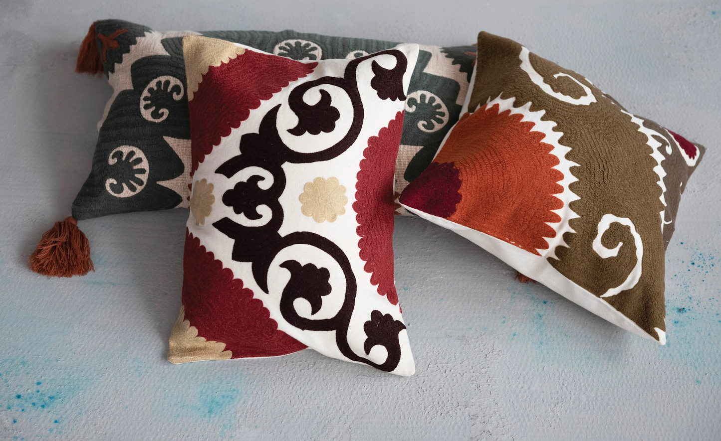 Cotton Lumbar Pillow with Suzani Embroidery and Tassels