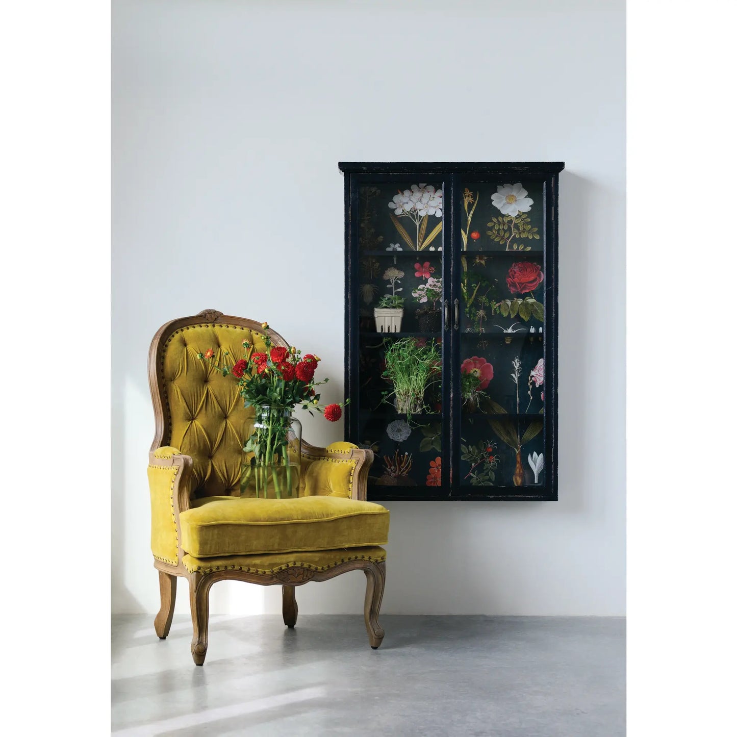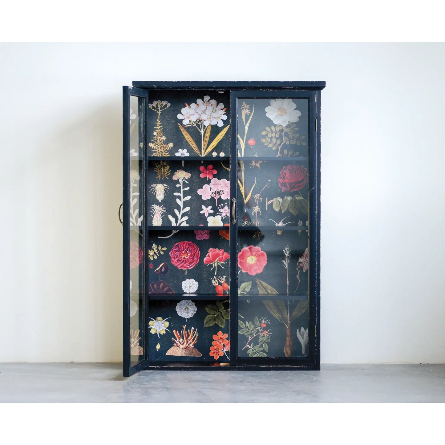 Beautifully crafted, this black cabinet has a floral back. There are 4 shelves for ample space to display your precious items. Glass doors allow those items to be seen while keeping them safely tucked inside.
