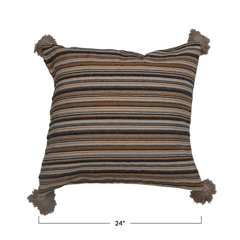 Woven Cotton Pillow with Stripes & Tassels, Multi Color