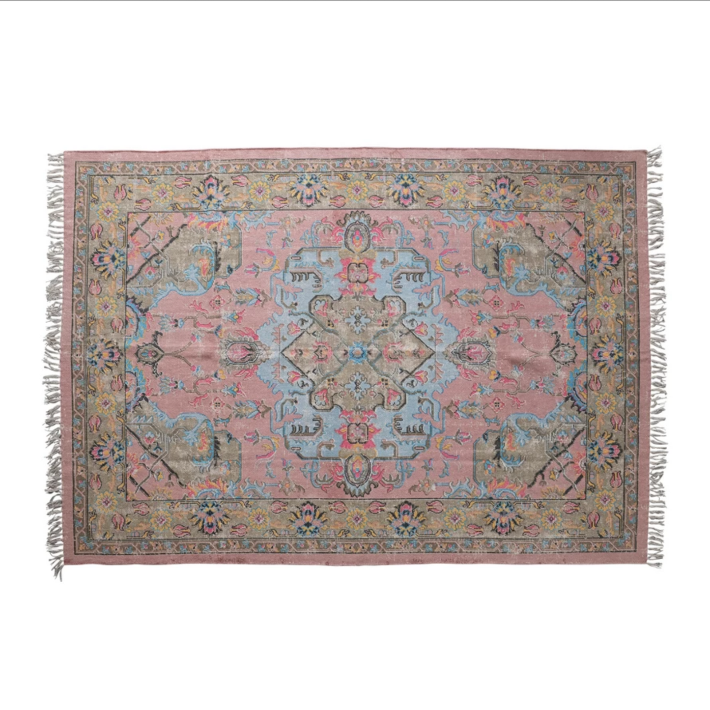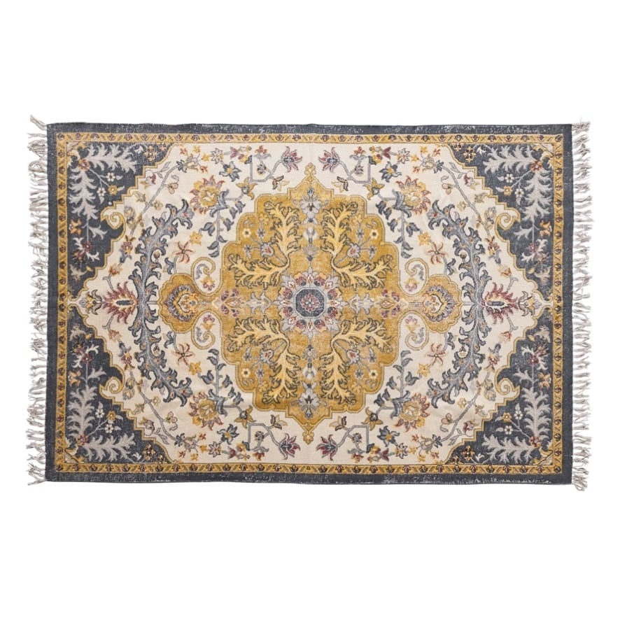 Woven Cotton Distressed Print Rug with Fringe