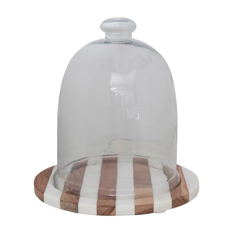 Glass Cloche with Striped Wood and Marble Base