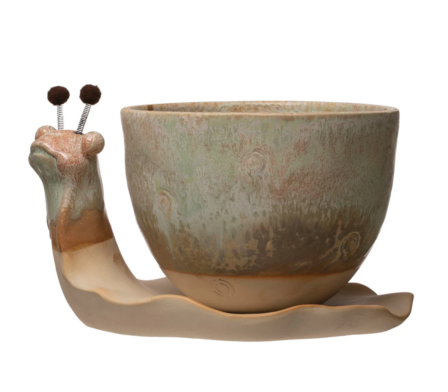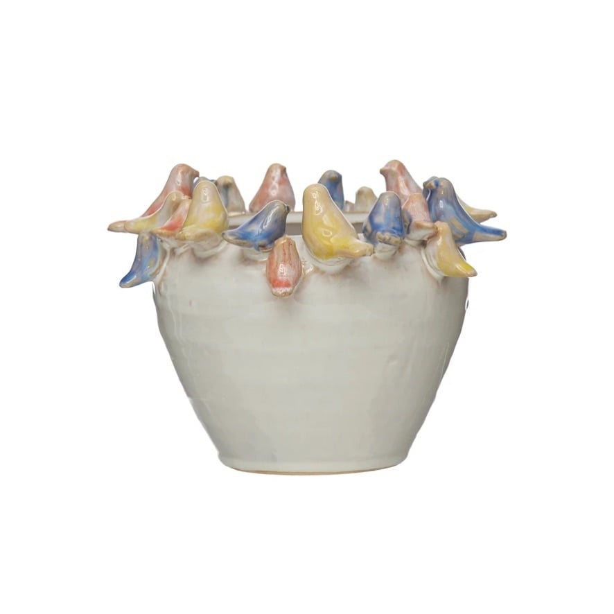 Stoneware Planter with Birds on Rim, Reactive Glaze