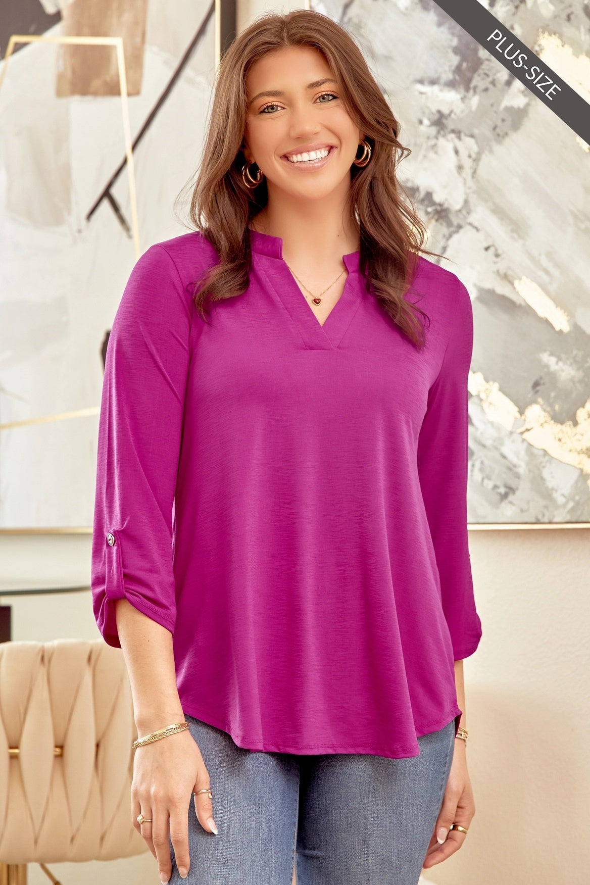 Hot Magenta Solid Wrinkle Free 3/4 Sleeve Top Lizzy 3X