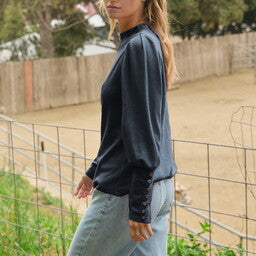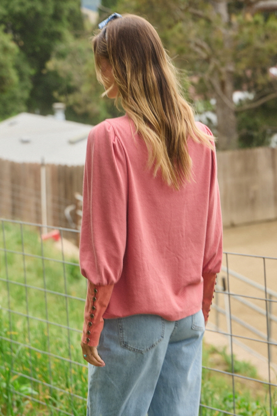 Acid washed baby thermal top with puffed long sleeve and contrast cuff detail.