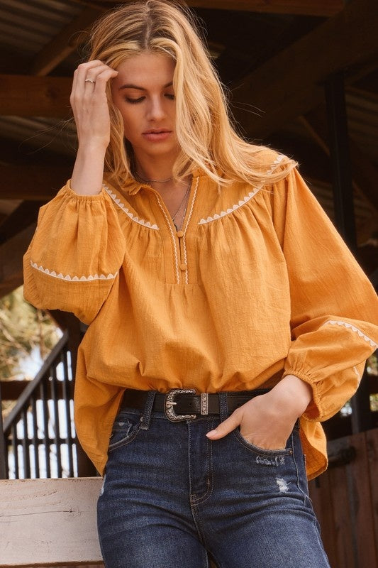 Embroidery ruffle neckline blouse with front button and puff long sleeve.