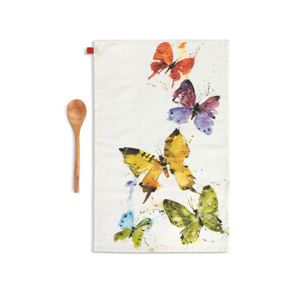 Cook and clean up in style with the colorful Flock of Butterflies Kitchen Towel & Utensil Set from the Dean Crouser collection. With cotton, linen and wood, this artisan kitchen set is a thoughtful and useful gift for a housewarming celebration!