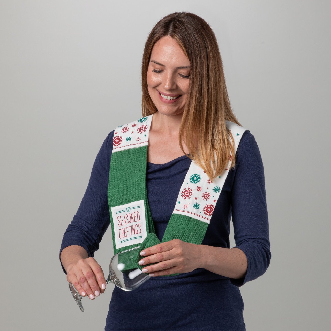 The cute Seasoned Greetings Boa is a great piece to gift to any host or hostess of an upcoming holiday celebration. This stylish towel features a unique elongated shape that can be easily draped around the neck while you cook, bake or host a party.