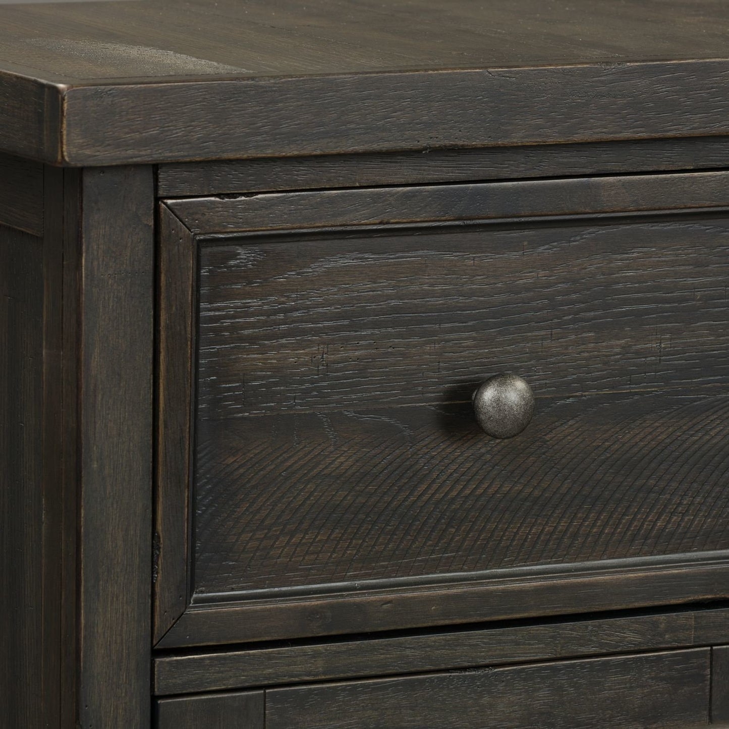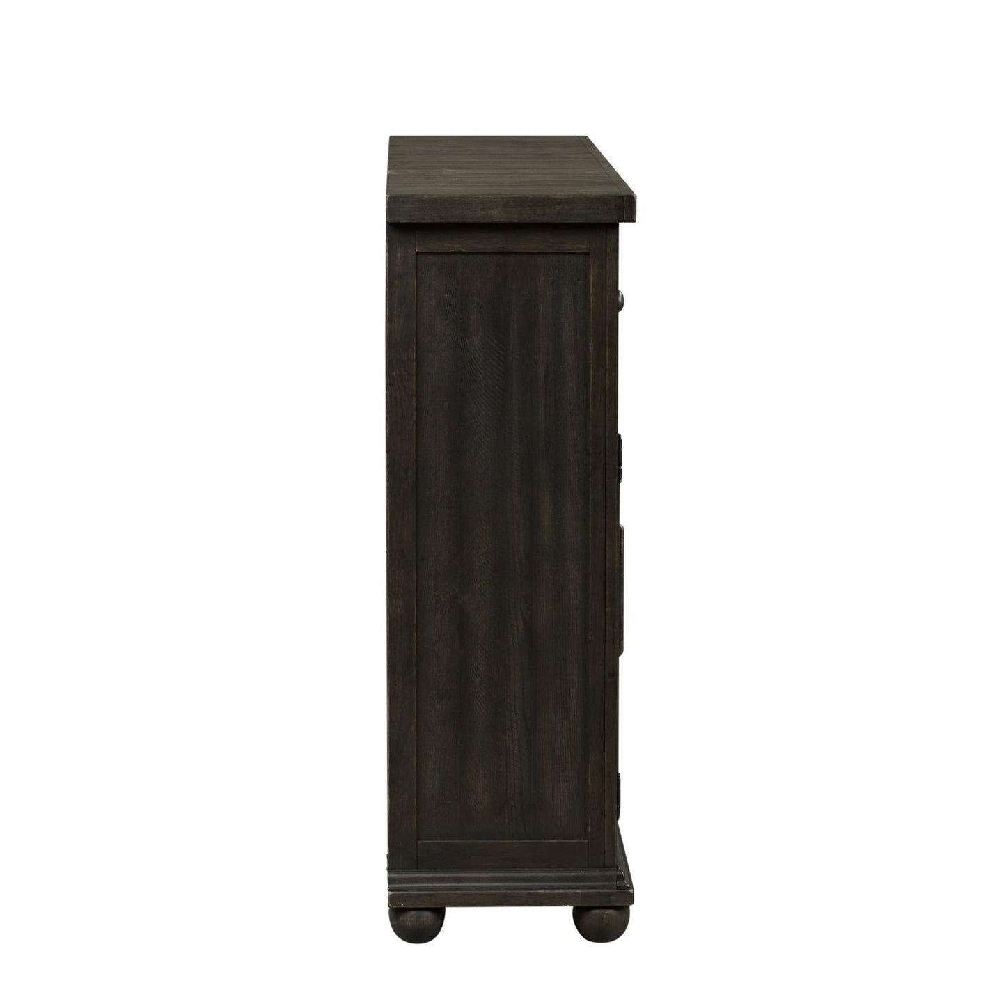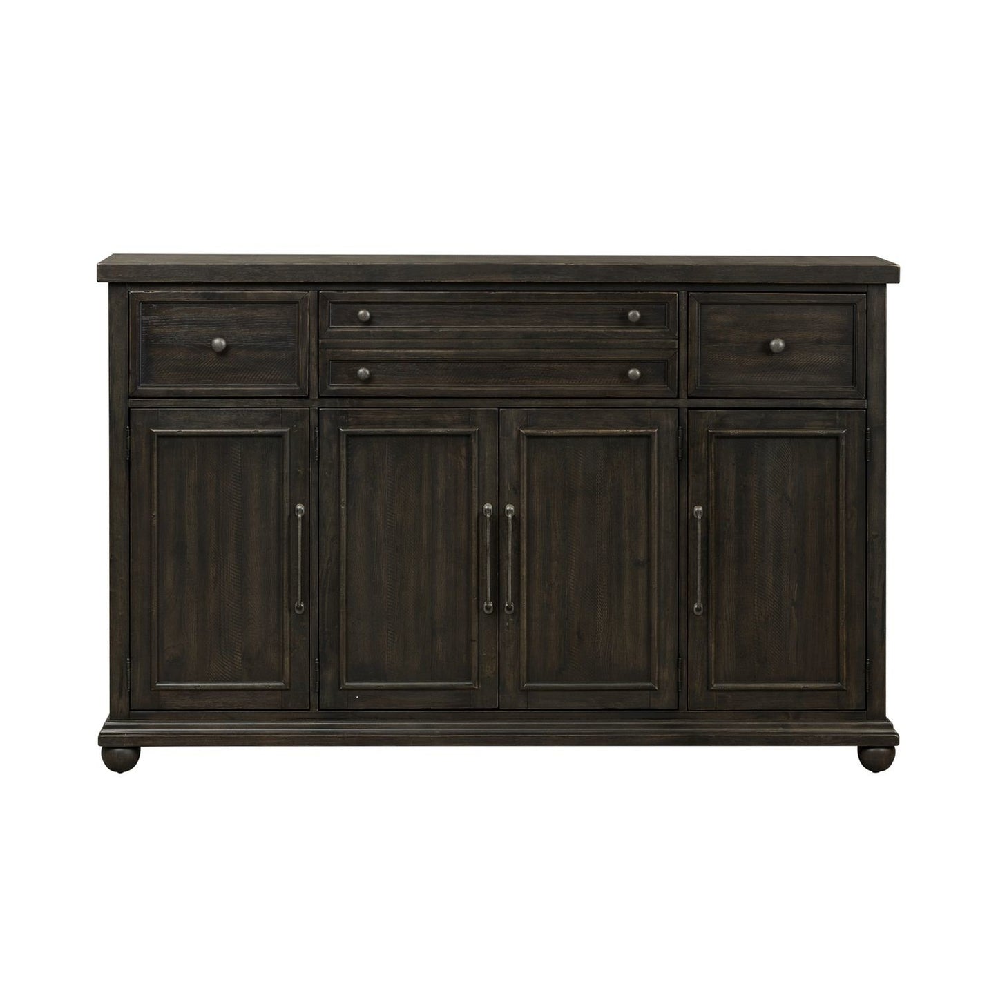 Classic styling and farmhouse appeal highlight the buffet along with bun feet and bead molding. Crafted of rubberwood solids and knotty white oak veneers finished in a chalkboard gray with antique pewter bar pull and knob hardware. Function and beauty combine with and 4 doors that open to 4 shelves for storage. The case is rounded out with three drawers that feature full extension drawer guides and a fully finished interior.