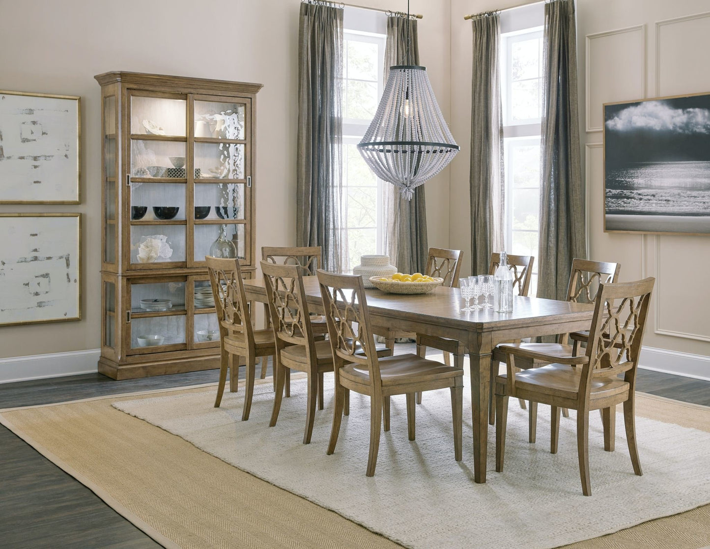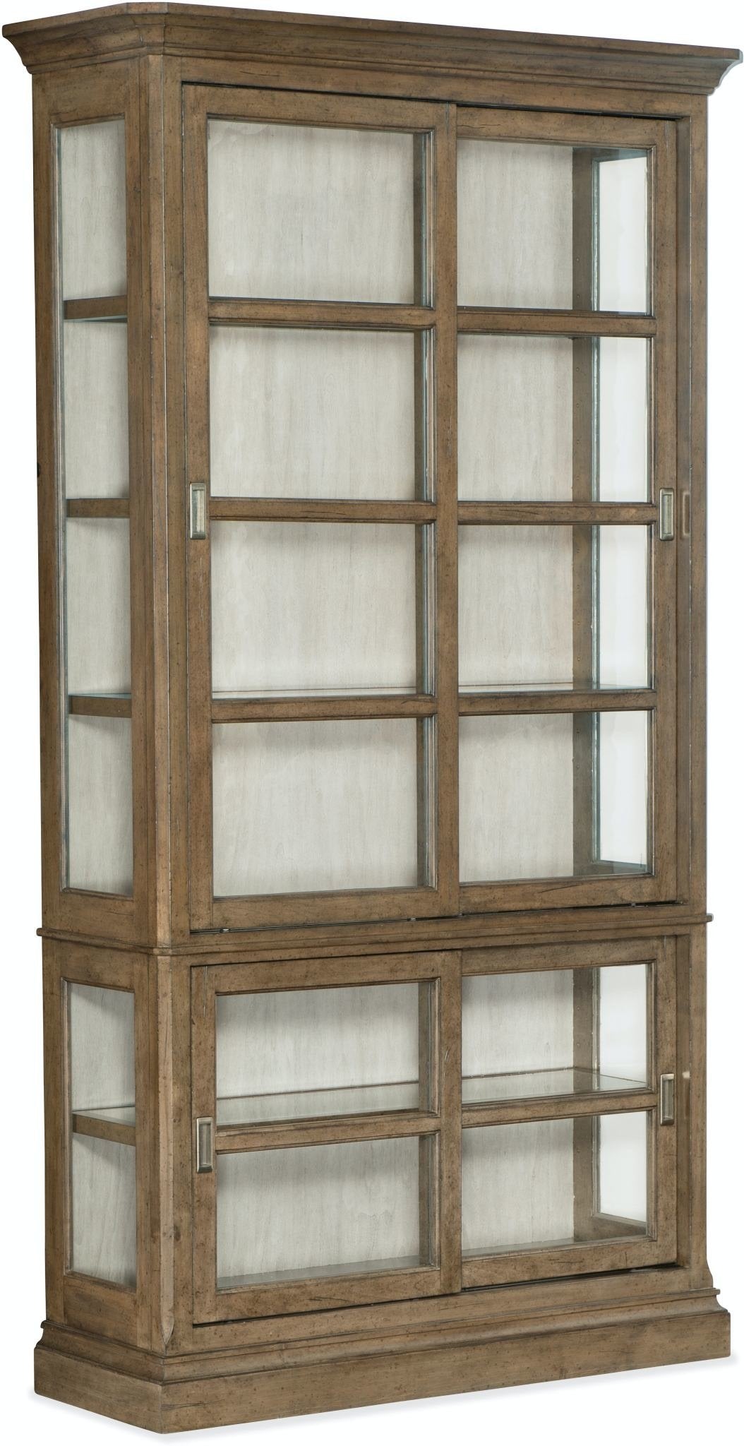 Crafted of genuine solid Alder wood, the cabinet has four wood-framed glass sliding doors, four adjustable wood-framed glass shelves and plate grooves on the shelves. Puck light with a touch switch is on the back of the right end panel. The Montebello collection of bedroom, dining room and occasional furniture is aimed at discerning consumers who demand fresh styling while appreciating the value and durability of solid wood construction. It is available in two color combinations: a two-tone look with a combination of white on solid poplar with brown solid alder tops or a single finish look with a brown finish on solid alder. Featuring casual traditional styling, the collection carries an aesthetic that is updated for today with slightly smaller scaling.