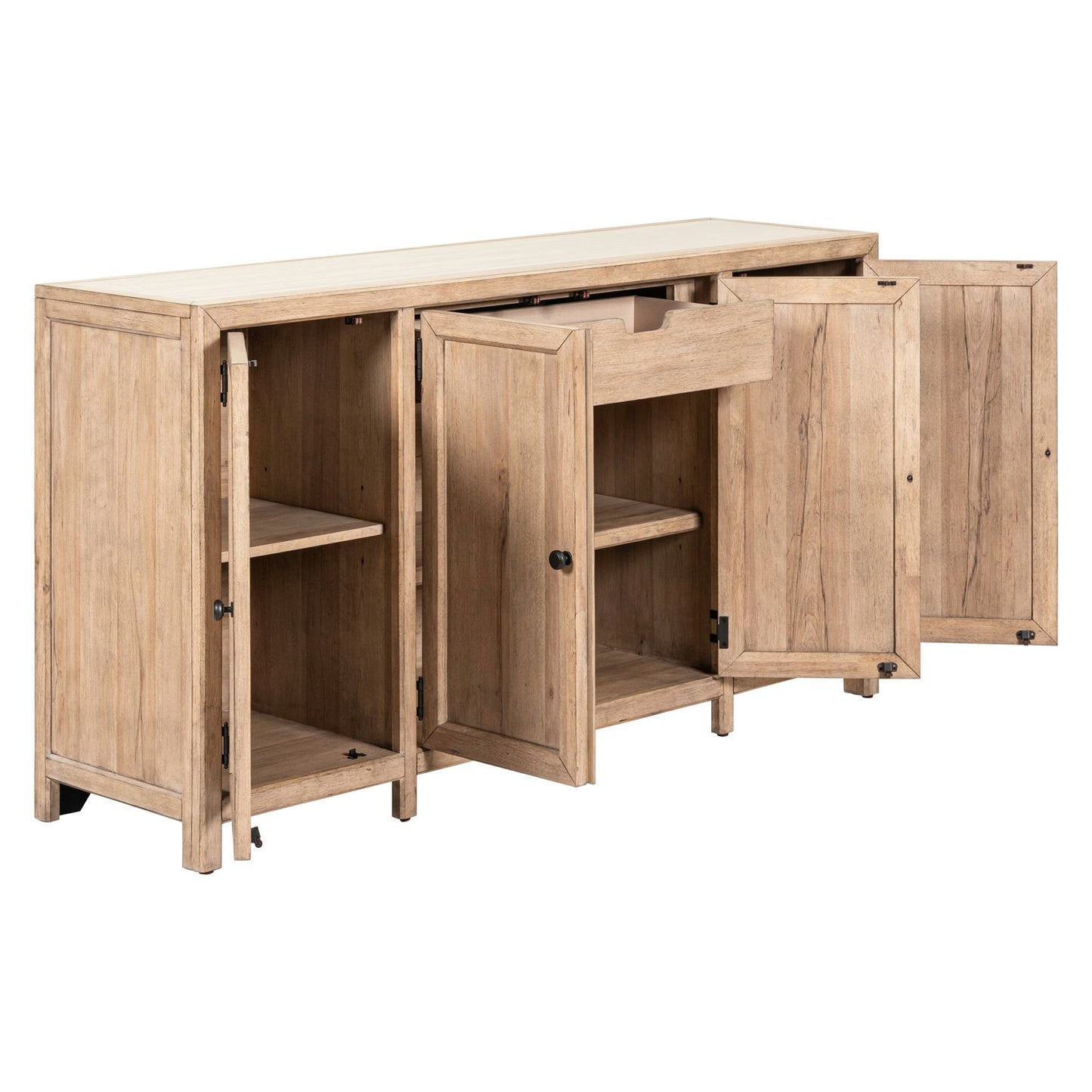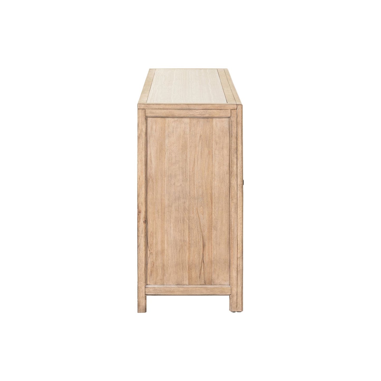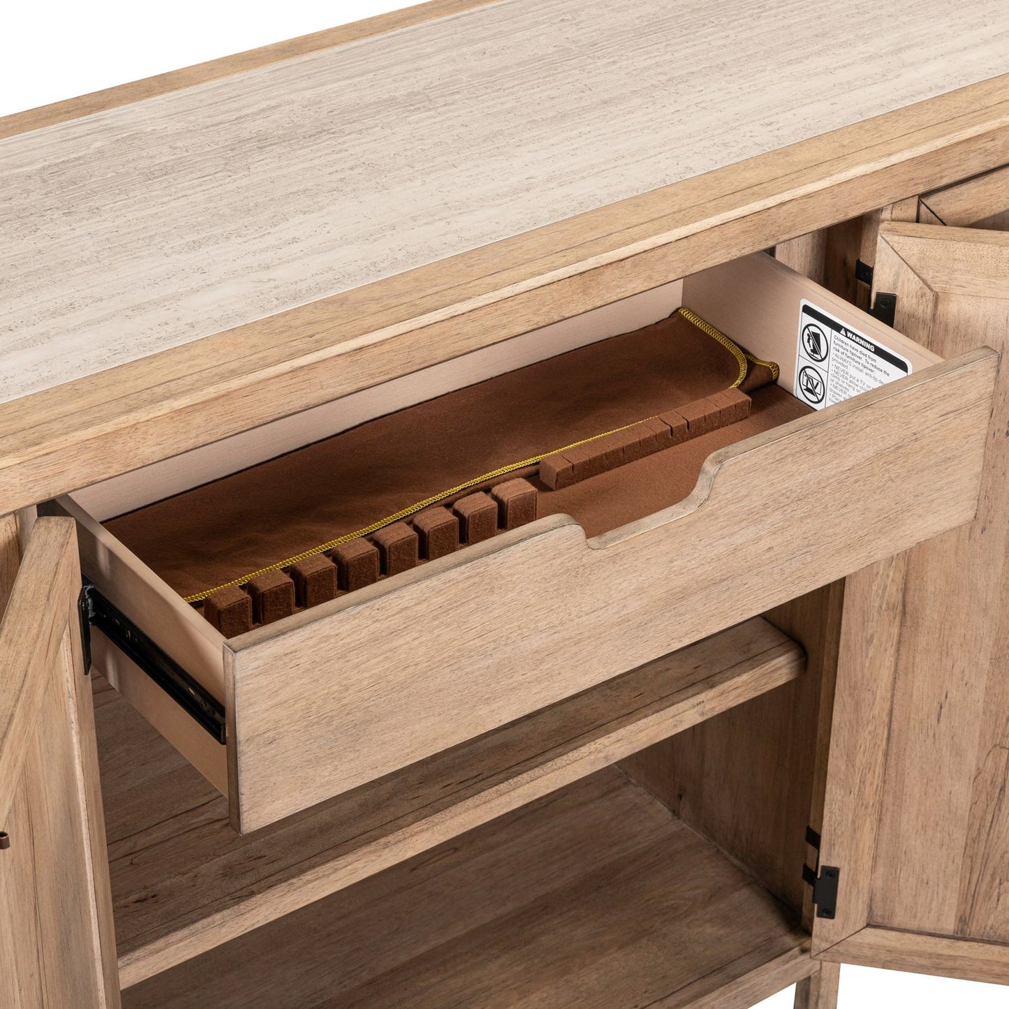 The Proximity Place accent buffet combines refined design with practical functionality. Crafted from Rubberwood solids and Rustic Flat Cut Birch veneers in a Barley Buff finish, this piece is highlighted by a stunning white stone insert on the top. Four wood-framed doors conceal generous storage, including a hidden drawer with a removable felt-lined silverware tray and adjustable wood shelves behind each door. Elegant details such as framed end panels, soft canted-edge picture frame molding, and sturdy block feet add a touch of sophistication, making this buffet a stylish and versatile addition to any room.