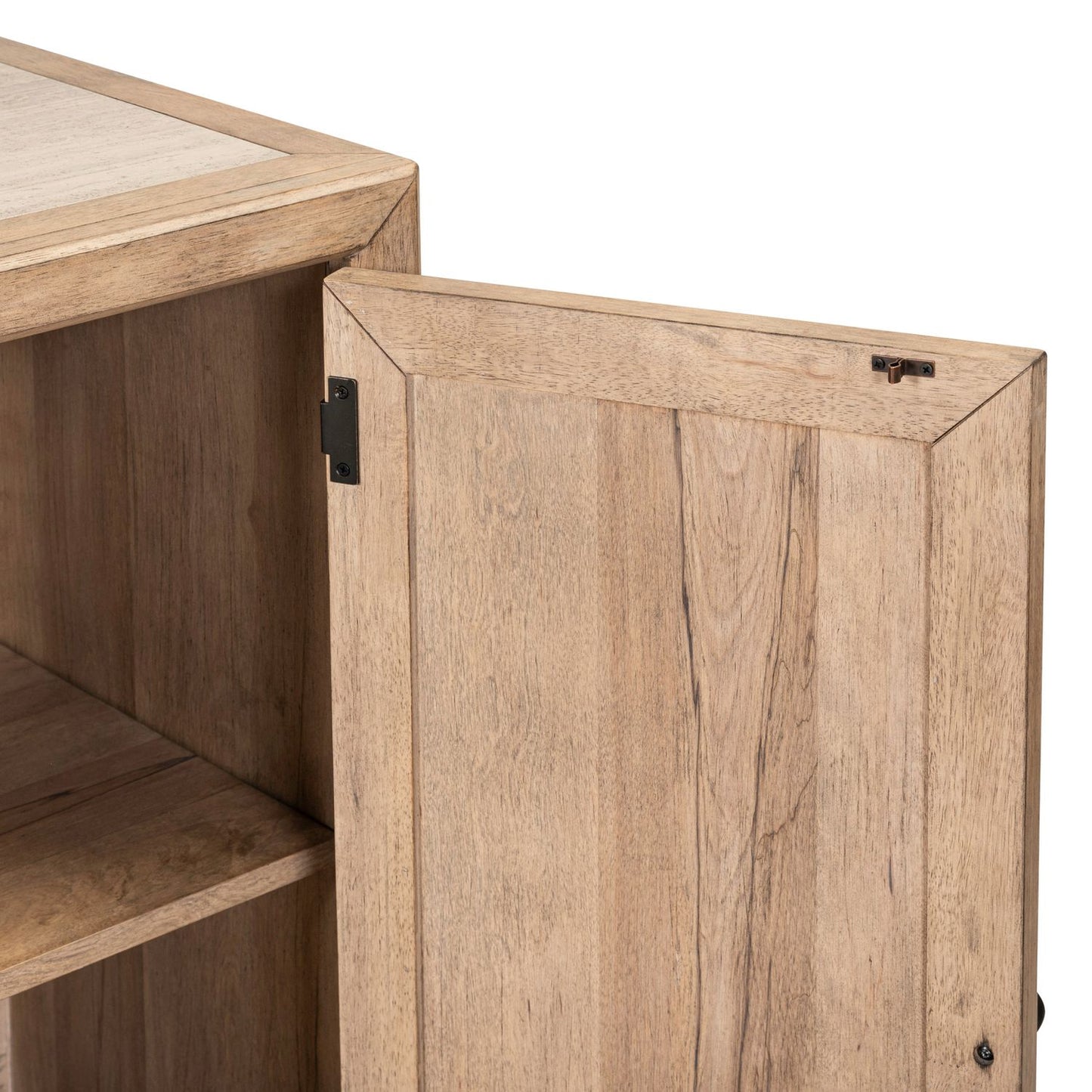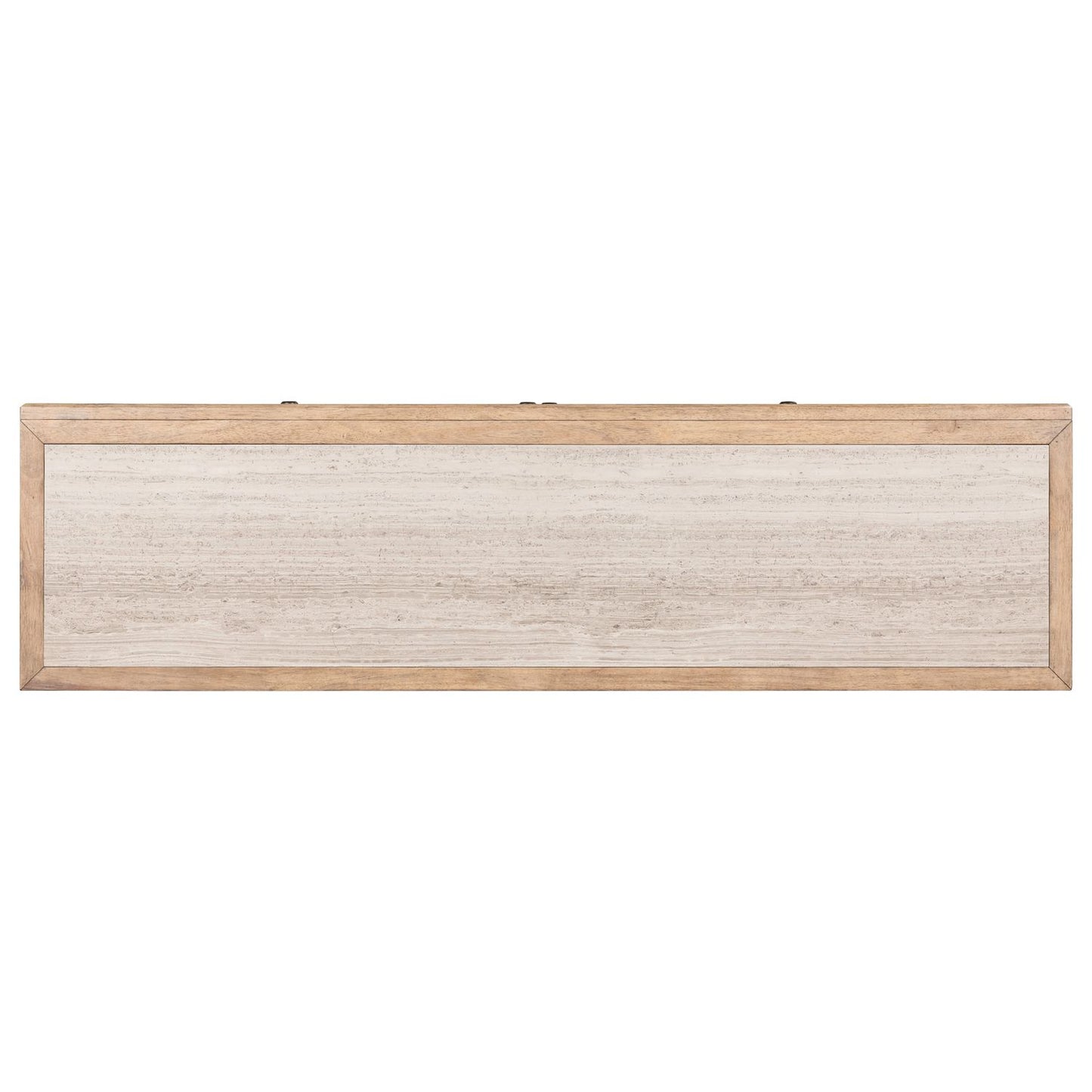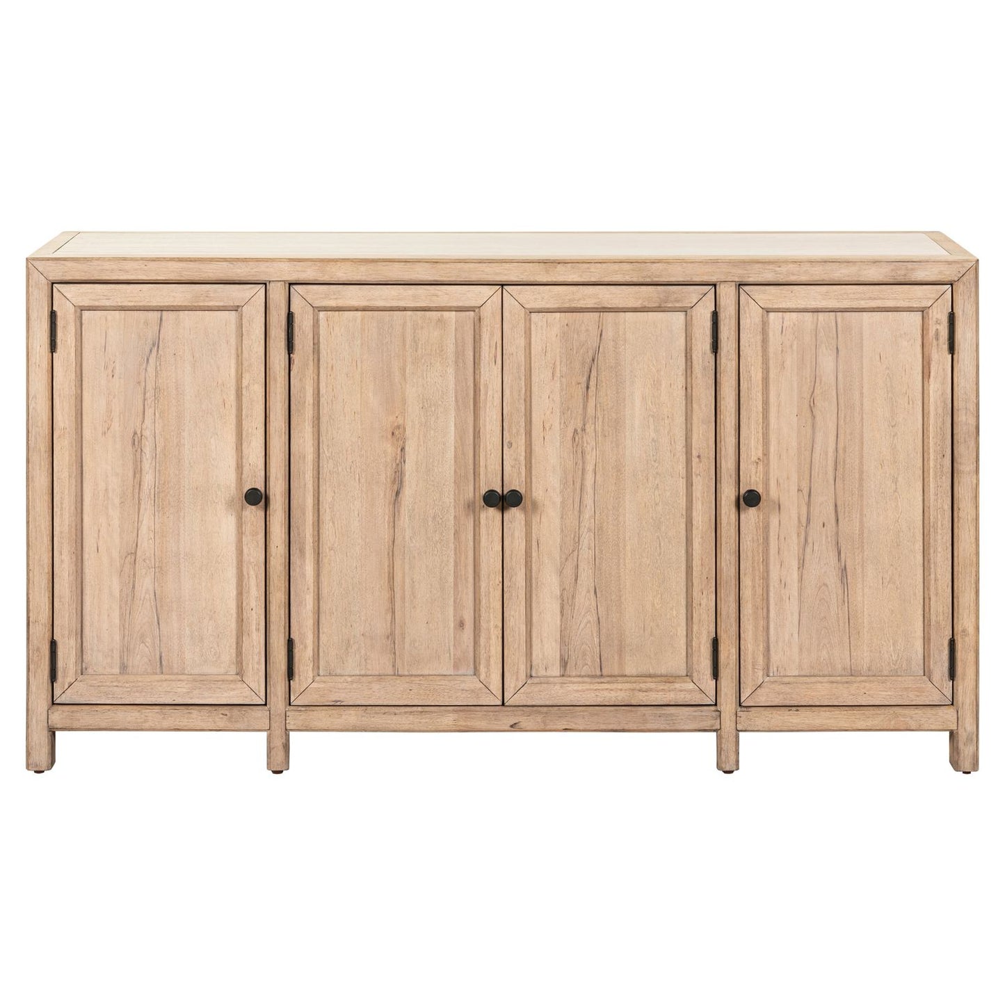 The Proximity Place accent buffet combines refined design with practical functionality. Crafted from Rubberwood solids and Rustic Flat Cut Birch veneers in a Barley Buff finish, this piece is highlighted by a stunning white stone insert on the top. Four wood-framed doors conceal generous storage, including a hidden drawer with a removable felt-lined silverware tray and adjustable wood shelves behind each door. Elegant details such as framed end panels, soft canted-edge picture frame molding, and sturdy block feet add a touch of sophistication, making this buffet a stylish and versatile addition to any room.