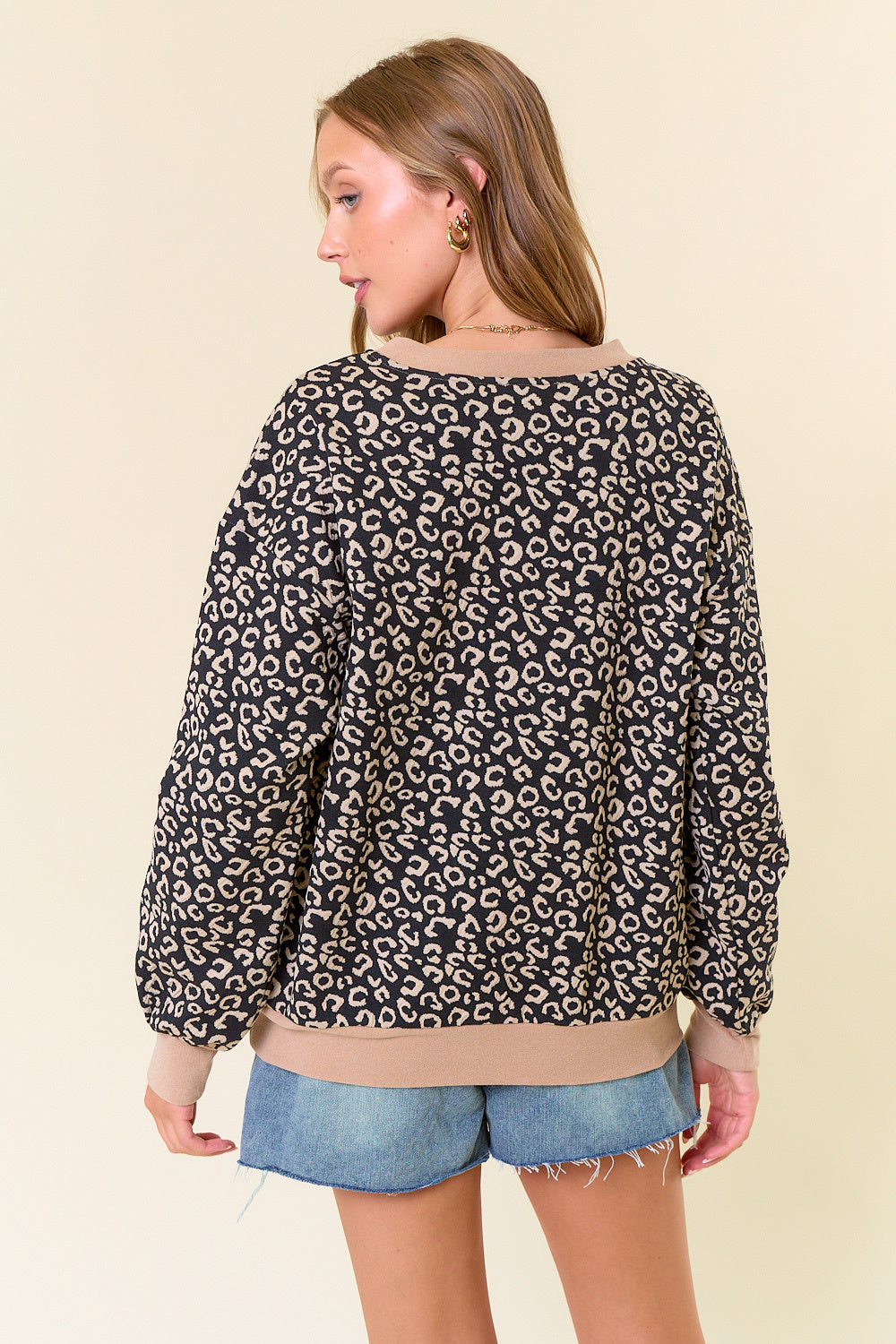 Leopard Jacquard Half Snap Button-down Long Sleeve Sweatshirt