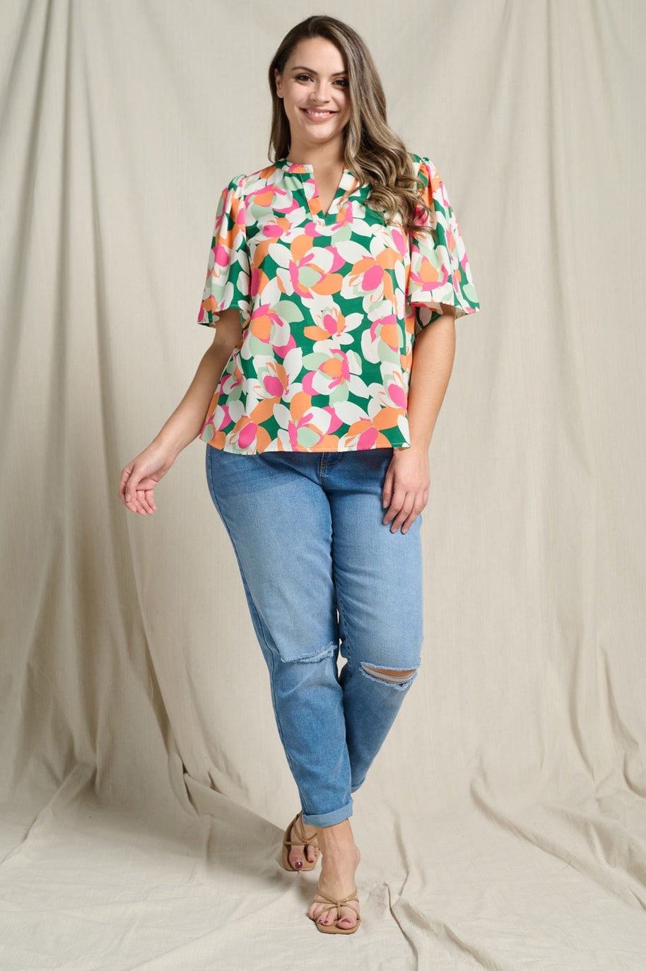 Abstract Floral Print Flutter Short Sleeve Blouse