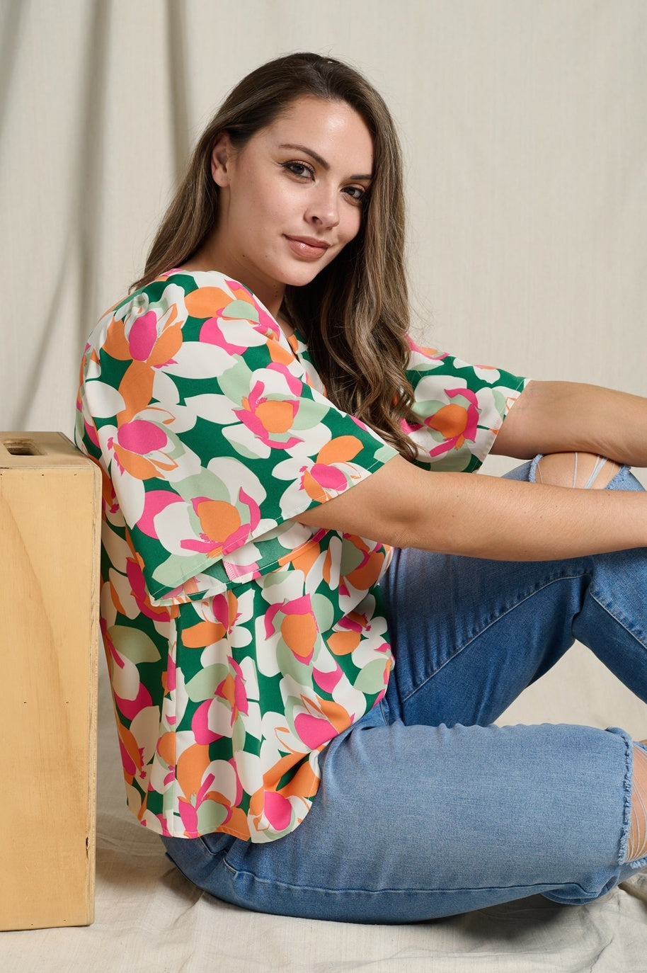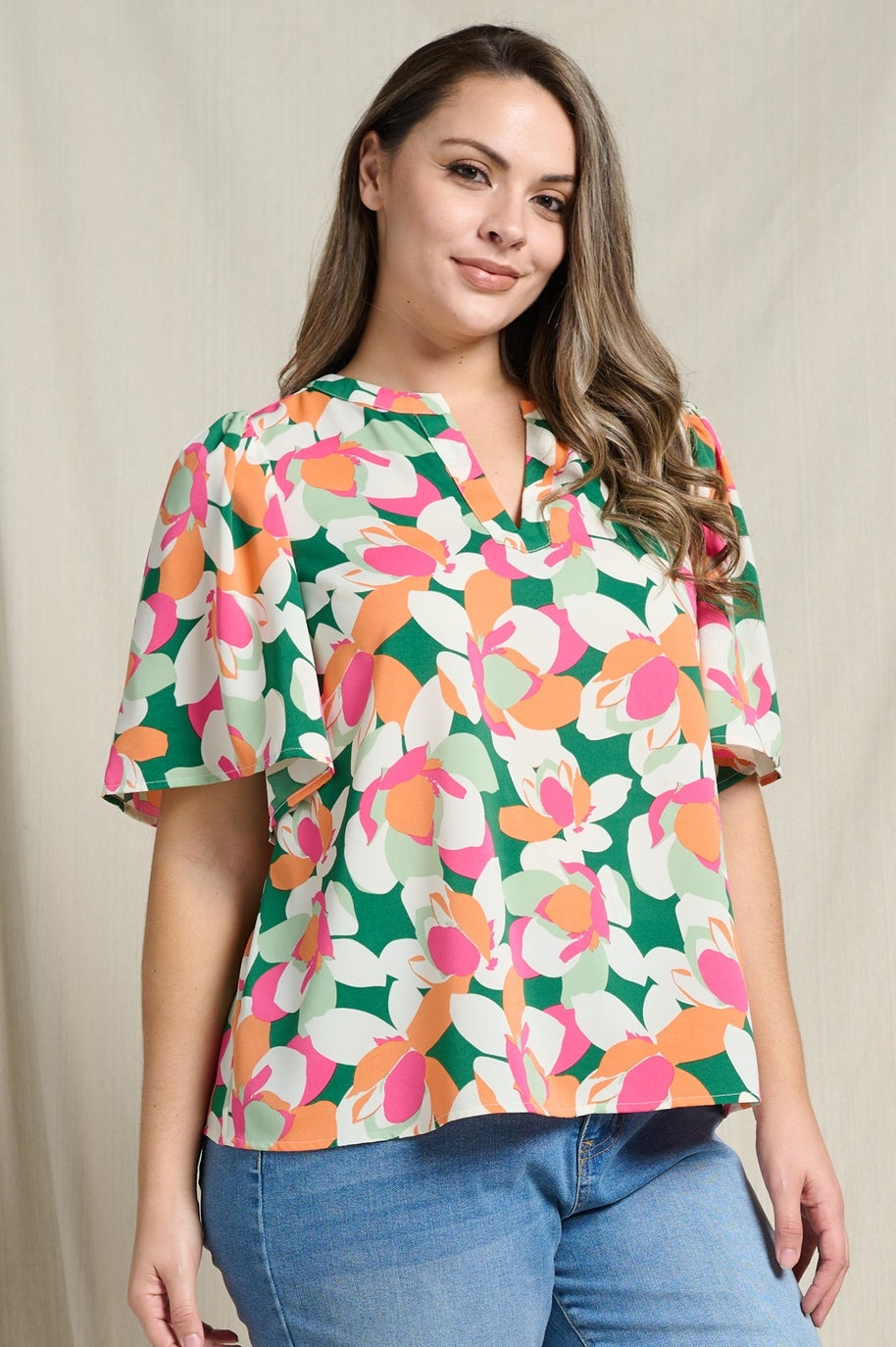 Abstract Floral Print Flutter Short Sleeve Blouse